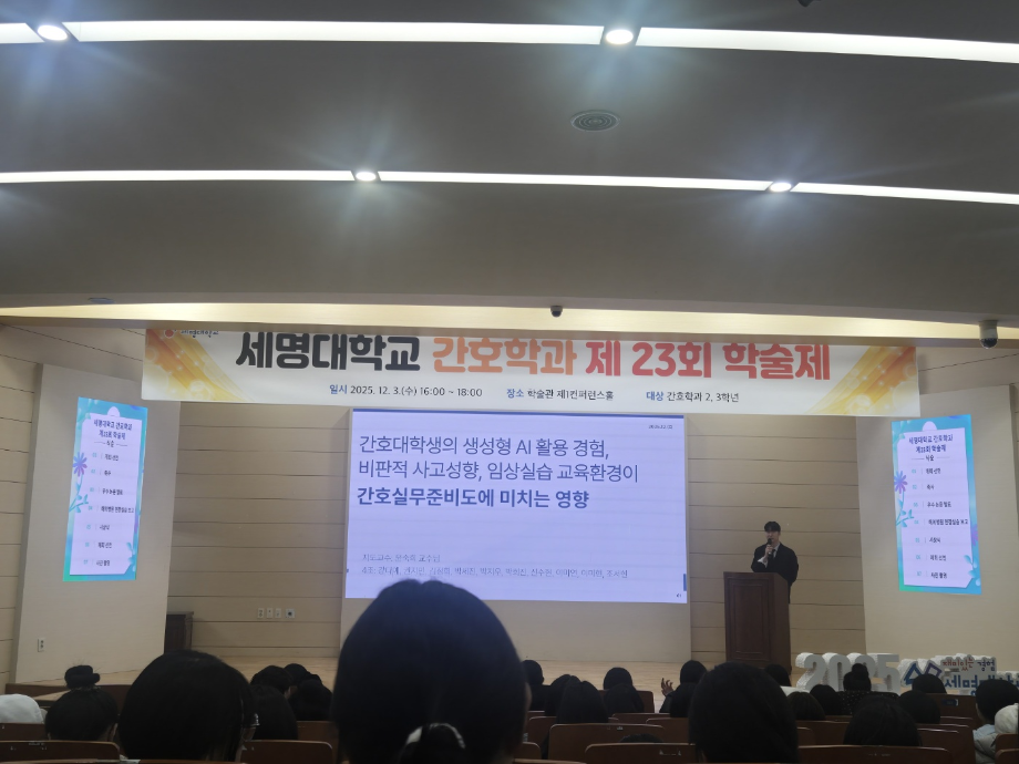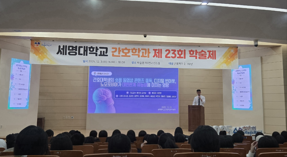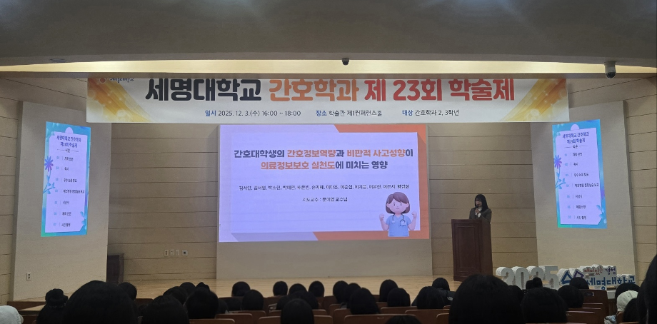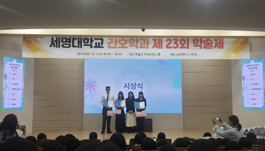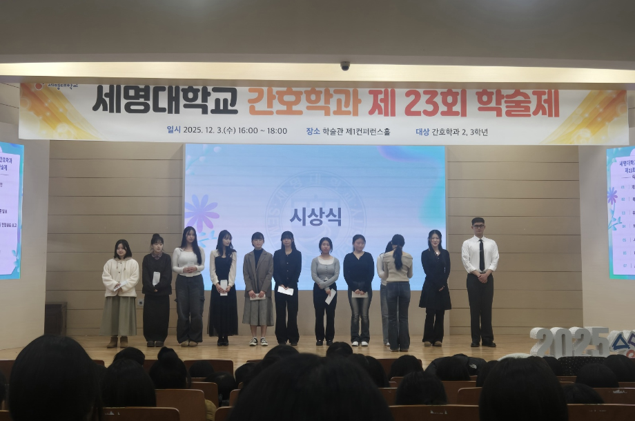 본문 시작 홈으로 커뮤니티 학과소개 교수소개 교육과정 학과소식 학과특성화 사업 커뮤니티 홈페이지가이드 포토갤러리 학사일정 포토갤러리 학생회 학과동아리 학과 취업정보 동창회 학과운영개선의견 발전기금 포토갤러리 페이스북 트위터 프린트 제 23회 간호학과 학술제 간호학과 166 2025-12-08 12/3 진행된 📝 2024 학술제 발표와 ✈ 해외 인턴십 경험 공유 후기가 학과 블로그에 업로드되었습니다. 발표 현장과 생생한 경험담이 궁금하다면 아래 링크를 확인해주세요 👇 🔗 링크 https://blog.naver.com/nursing_smu_official/224099825798 목록 이전📍 ‘임상실습 안전사고 ZERO를 위하여’ 특강 담당부서 : 간호학과 담당자 : - 연락처 : 043-649-1357 최종수정일 : 2024-10-26 만족도조사 만족도 조사 이 페이지에서 제공하는 정보에 대하여 만족하시나요? 매우만족 만족 보통 불만족 매우불만족