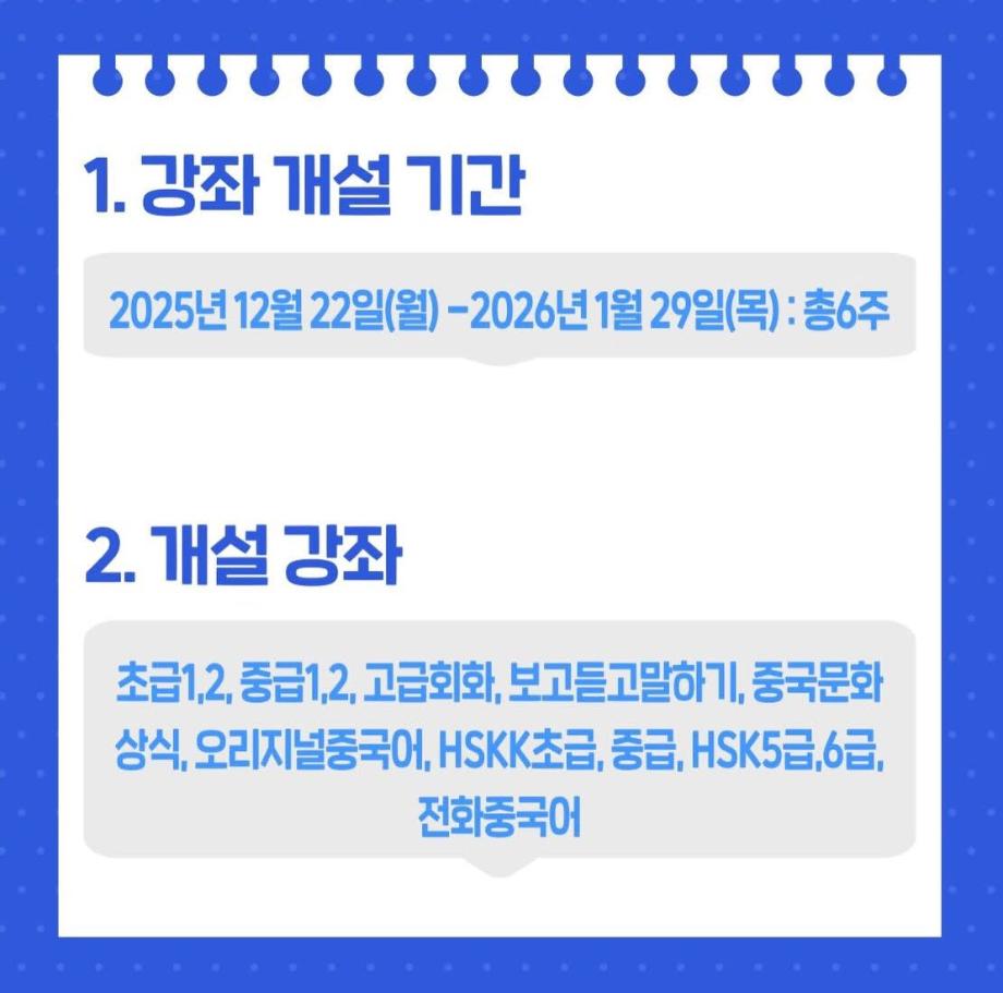 세명대학교 공자학원에서 중국어 학습을 희망하는 분들을 위해 초급부터 고급 과정, 회화 수업, HSK·HSKK 대비반 등 다양한 중국어 강좌를 운영하고 있습니다.