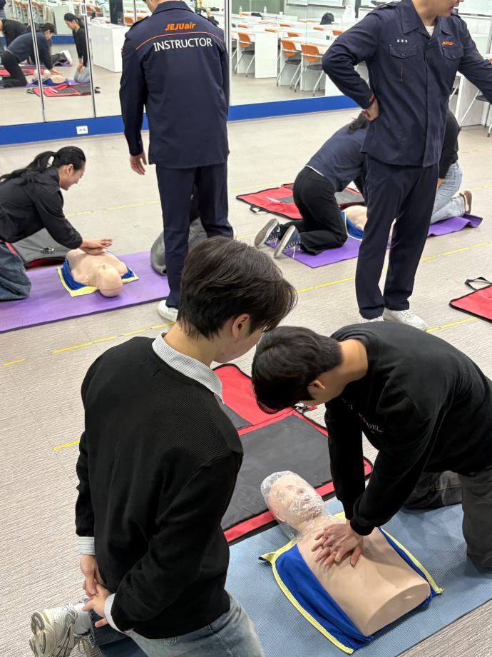 제주항공🧡에서 세명대학교 항공서비스학과 학생들을 상대로 안전 보안 관련해서 호신술과 응급처치 등 체험을 진행해 주셨습니다!