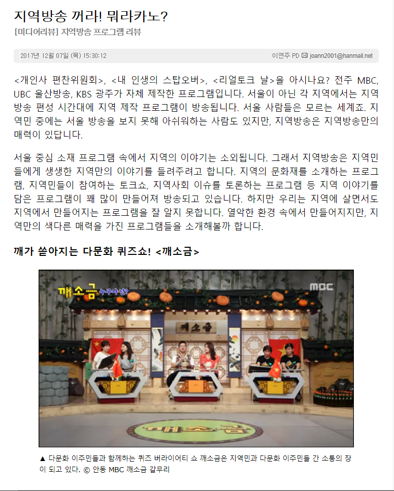 본문 시작 게시판 대학원소개 교수/학생소개 교과과정 입학/학사안내 공지사항 게시판 저널리즘연구소 홈페이지가이드 단비뉴스 편집실 단비뉴스 편집실 단비서재 세저리 이야기 언론사 채용공고 언론계 동향 언시 후기 사진첩 언론 현장에서 단비뉴스 편집실 페이스북 트위터 프린트 지역방송 꺼라! 뭐라카노? 이민호 조회 : 5792 등록일 : 2017-12-08 목록 이전영화 예능이 불편한 이유 다음 청년 마음 사로잡아 ‘소멸위기’ 벗어난다 댓글수 1개 wordia**** 2017-12-08 03:08:26기사전문을 확인하려면 아래 링크를 클릭하세요!http://www.danbinews.com/news/articleView.html?idxno=9726 * 작성자 * 내용 댓글은 로그인 후에 이용해 주세요. 로그인