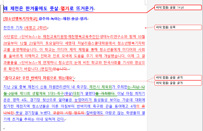 겁<단비뉴스>에 올라오는 기사의 원본과 최종본은 얼마나 차이날까요? 교수님들이 어떻게 기사를 수정하셨는지 배우고 싶으면 이곳 '단비뉴스 편집실'에 자주 들어오세요. 첨삭한 원본과 수정본, 그리고 교수님들의 코멘트를 보실 수 있습니다.