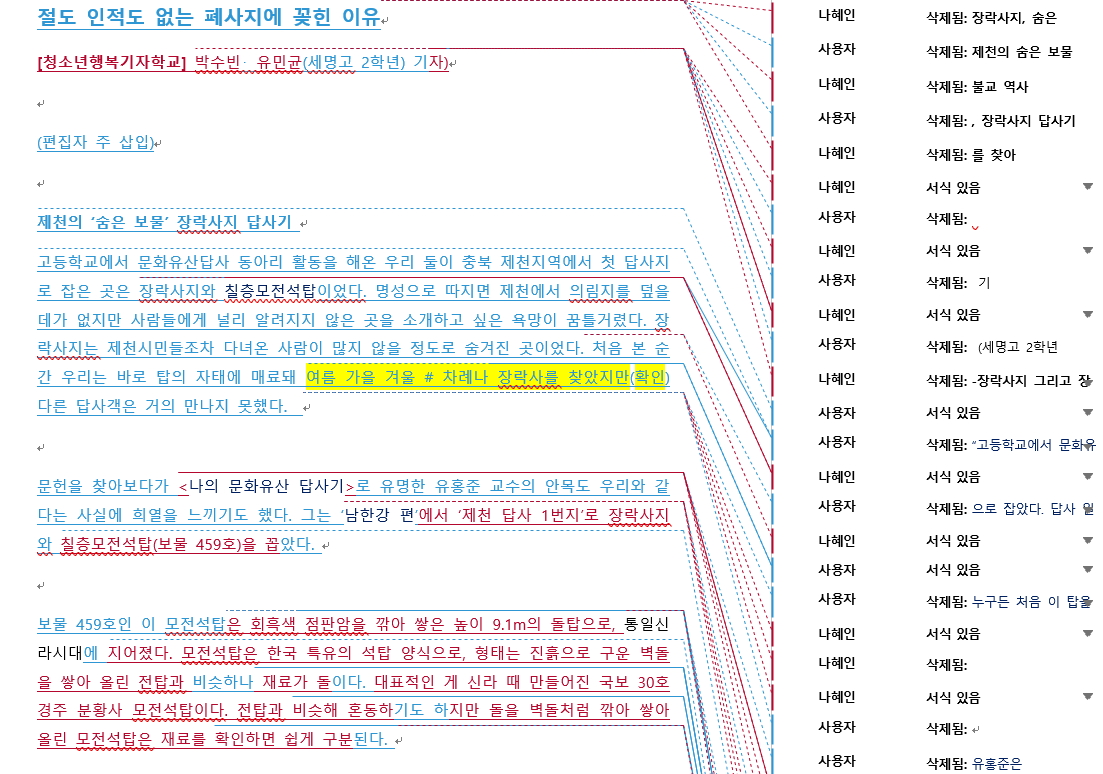 <단비뉴스>에 올라오는 기사의 원본과 최종본은 얼마나 차이날까요? 교수님들이 어떻게 기사를 수정하셨는지 배우고 싶으면 이곳 '단비뉴스 편집실'에 자주 들어오세요. 첨삭한 원본과 수정본, 그리고 교수님들의 코멘트를 보실 수 있습니다.