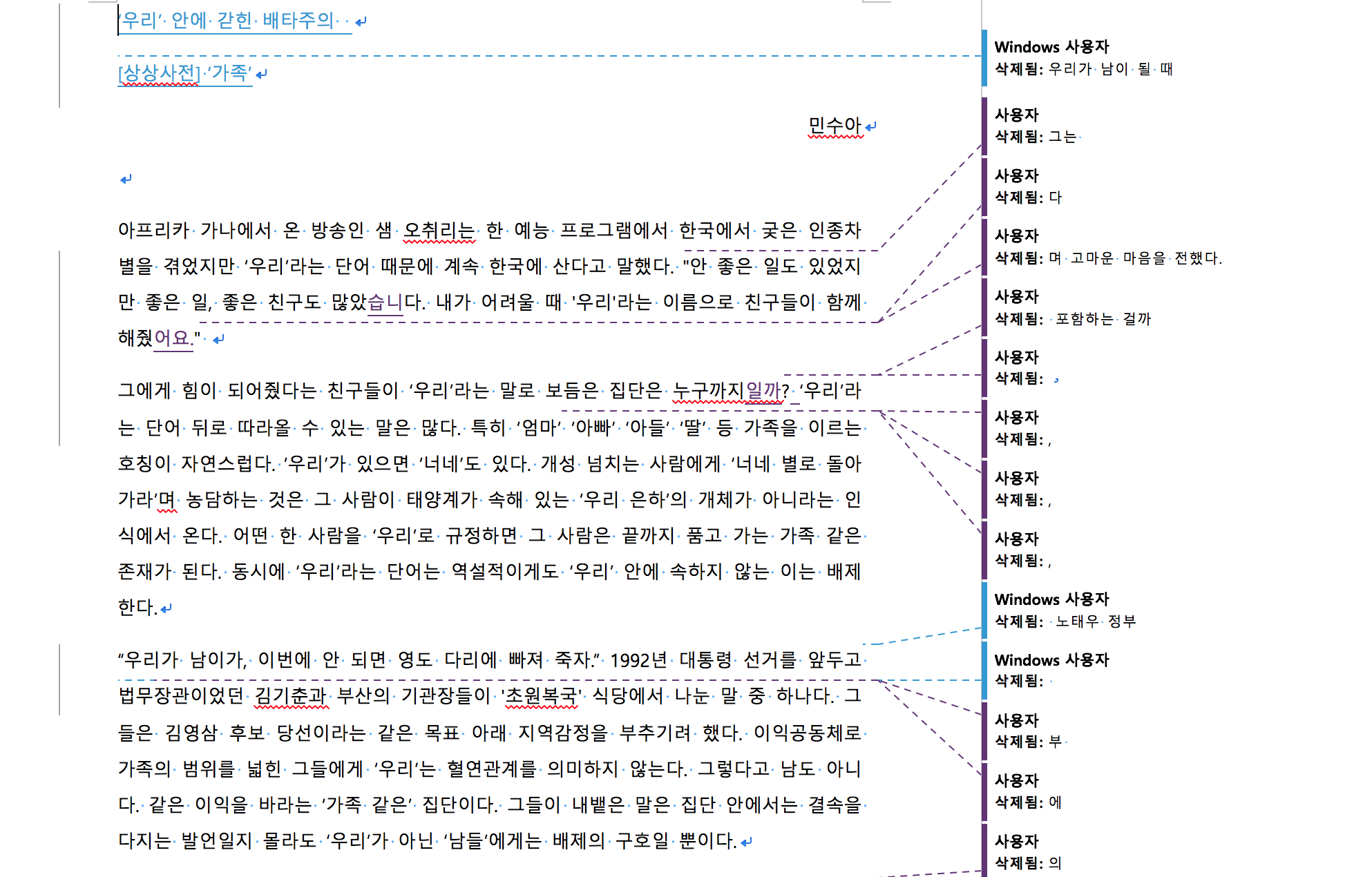 오늘은 민수아 기자의 칼럼 <‘우리’ 안에 갇힌 배타주의> 입니다. 어릴적 '영도다리 밑에서 주워 왔으니 진짜 부모 찾아가라'는 부모님의 농담에 겁을 먹었던 기억부터 박근혜 정부 블랙리스트까지. '우리'라는 말의 배타성이 실은 얼마나 폭력적인지에 관한 성찰을 다양한 사례로 쉽게 풀었습니다. 자세한 내용은 기사를 통해 확인하세요!