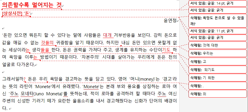 오늘은 윤연정 기자의 칼럼 <의존할수록 멀어지는 것> 입니다. '돈'을 주제로 쓴 상상사전입니다. 모든 욕망을 이뤄줄 것 같은 돈이지만 인간의 모든 욕망을 흔하고 가치 없는 것으로 전락시키는 것도 돈이라고 합니다. 자세한 내용은 기사를 통해 확인하세요!
