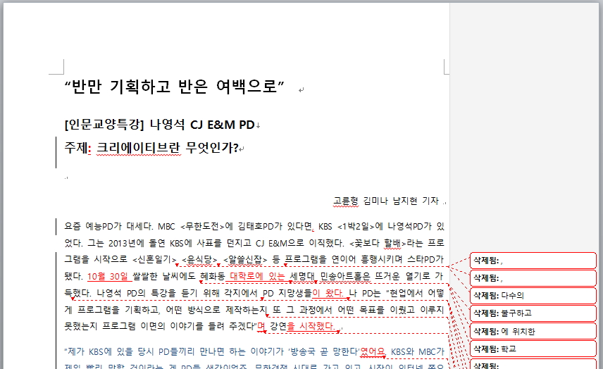 오늘은 김미나, 남지현, 기자의 <“반만 기획하고 반은 여백으로”> 기사입니다. 나영석 CJ E&M PD가 '주제: 크리에이티브란 무엇인가?'을 주제로 인문교양특강을 진행했습니다. 나PD는 PD지망생들에게 현실적인 조언을 아끼지 않았는데요, 자세한 내용은 기사를 통해 확인하세요!