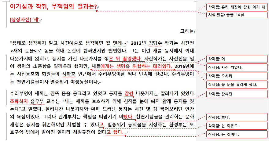<단비뉴스>에 올라오는 기사의 원본과 최종본은 얼마나 차이날까요? 교수님들이 어떻게 기사를 수정하셨는지 배우고 싶으면 이곳 '단비뉴스 편집실'에 자주 들어오세요. 첨삭한 원본과 수정본, 그리고 교수님들의 코멘트를 보실 수 있습니다.