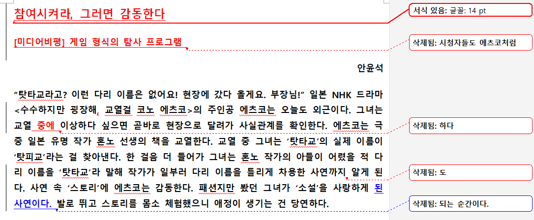 <단비뉴스>에 올라오는 기사의 원본과 최종본은 얼마나 차이날까요? 교수님들이 어떻게 기사를 수정하셨는지 배우고 싶으면 이곳 '단비뉴스 편집실'에 자주 들어오세요. 첨삭한 원본과 수정본, 그리고 교수님들의 코멘트를 보실 수 있습니다.