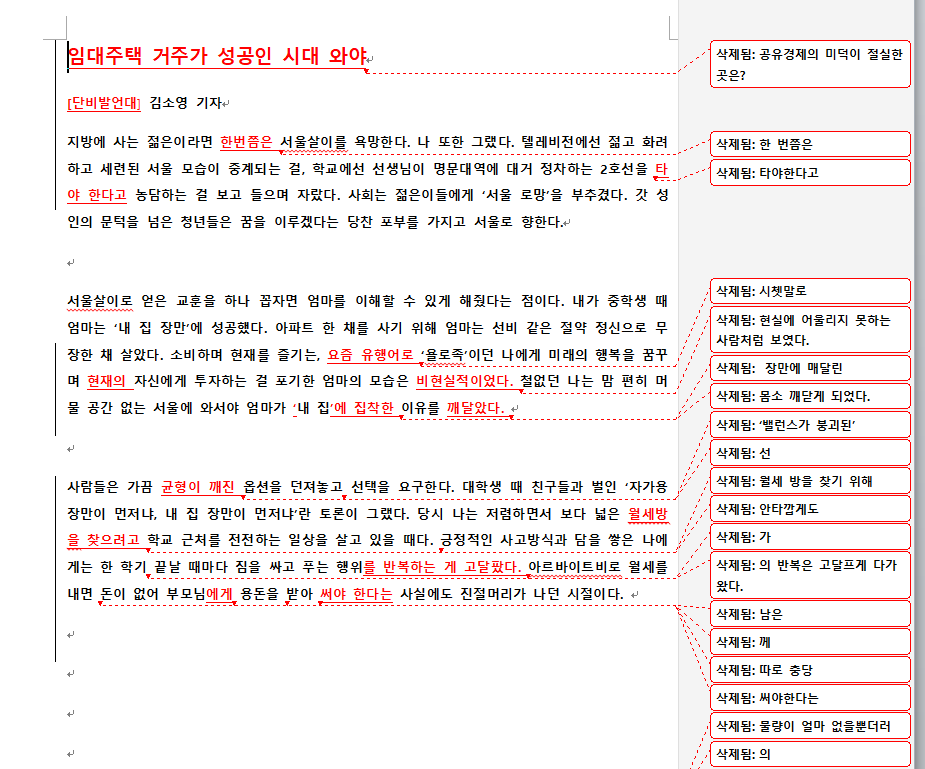 <단비뉴스>에 올라오는 기사의 원본과 최종본은 얼마나 차이날까요? 교수님들이 어떻게 기사를 수정하셨는지 배우고 싶으면 이곳 '단비뉴스 편집실'에 자주 들어오세요. 첨삭한 원본과 수정본, 그리고 교수님들의 코멘트를 보실 수 있습니다.