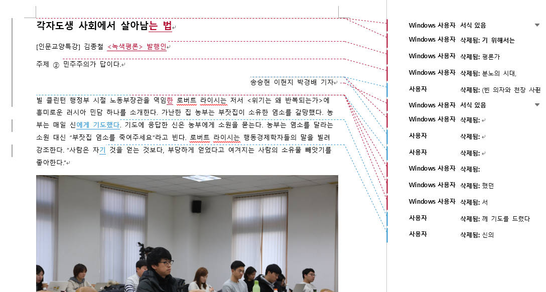 <단비뉴스>에 올라오는 기사의 원본과 최종본은 얼마나 차이날까요? 교수님들이 어떻게 기사를 수정하셨는지 배우고 싶으면 이곳 '단비뉴스 편집실'에 자주 들어오세요. 첨삭한 원본과 수정본, 그리고 교수님들의 코멘트를 보실 수 있습니다.