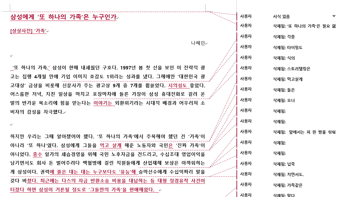 오늘 기사는 나혜인 기자의 칼럼 <삼성에게 '또 하나의 가족'은 누구인가>입니다. 이글은 대기업 삼성이 가족주의를 내세우면서 반도체 노동자 등 개인을 희생시키는 구조를 문제삼고 있습니다. 자세한 내용은 기사를 통해 확인하세요!