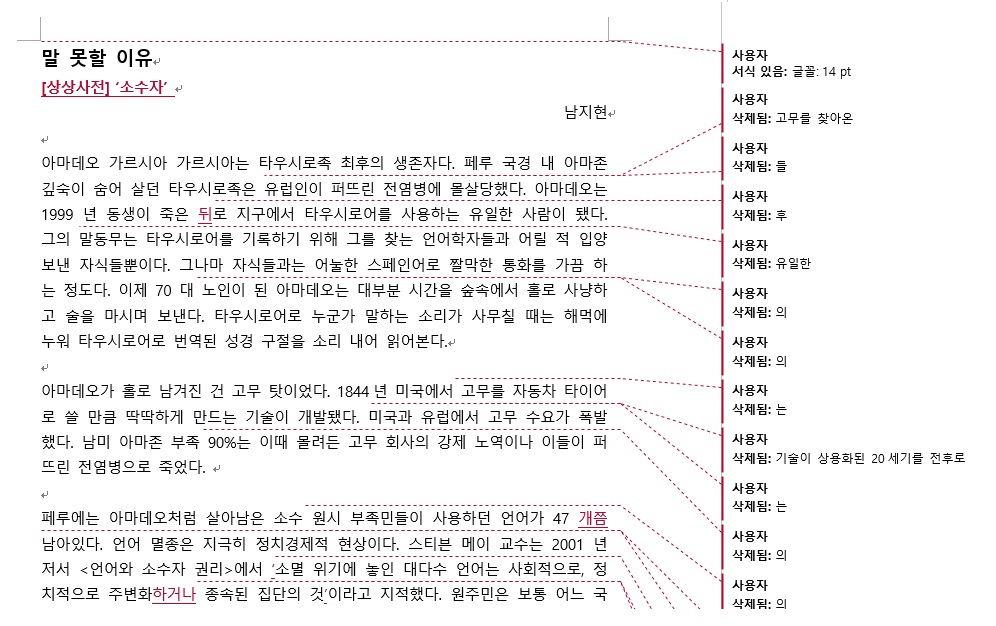 <단비뉴스>에 올라오는 기사의 원본과 최종본은 얼마나 차이날까요? 교수님들이 어떻게 기사를 수정하셨는지 배우고 싶으면 이곳 '단비뉴스 편집실'에 자주 들어오세요. 첨삭한 원본과 수정본, 그리고 교수님들의 코멘트를 보실 수 있습니다.