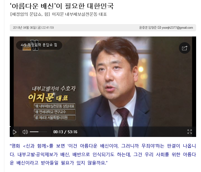 본문 시작 게시판 대학원소개 교수/학생소개 교과과정 입학/학사안내 공지사항 게시판 저널리즘연구소 홈페이지가이드 단비뉴스 편집실 단비뉴스 편집실 단비서재 세저리 이야기 언론사 채용공고 언론계 동향 언시 후기 사진첩 언론 현장에서 단비뉴스 편집실 페이스북 트위터 프린트 ‘아름다운 배신’이 필요한 대한민국 장현석 조회 : 5455 등록일 : 2018-04-07 목록 이전군 인권과 주민생존, 투트랙으로 풀어야 다음 디지털 봉건시대의 권리장전 댓글수 1개 장현석 2018-04-07 00:12:13기사전문을 확인하려면 아래 링크를 클릭하세요!http://www.danbinews.com/news/articleView.html?idxno=10169 * 작성자 * 내용 댓글은 로그인 후에 이용해 주세요. 로그인