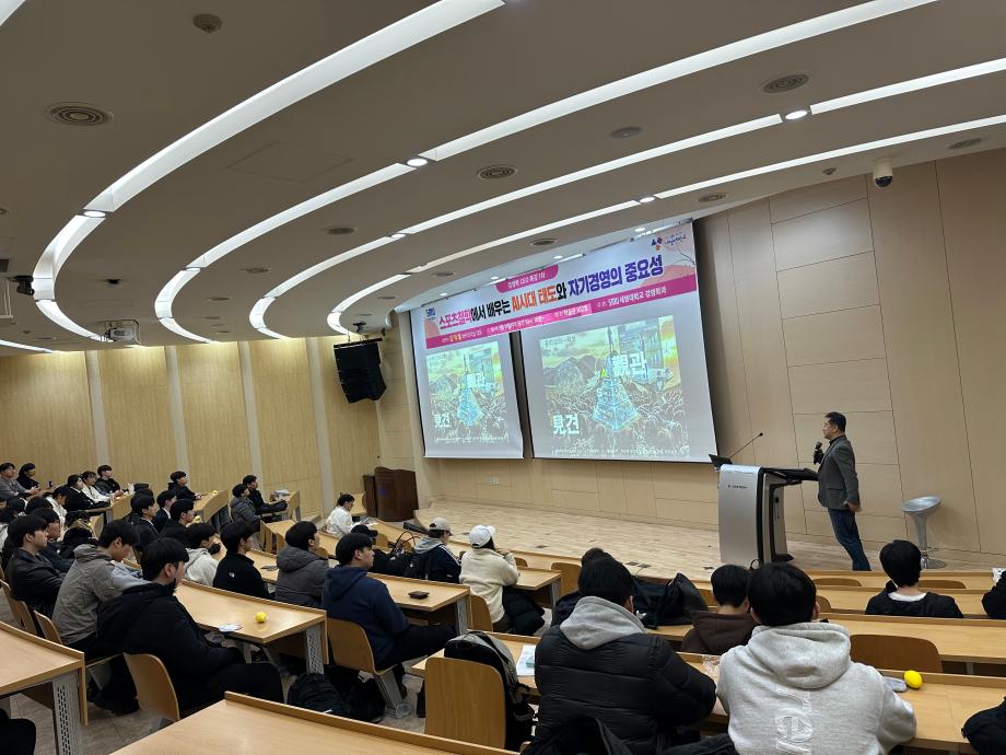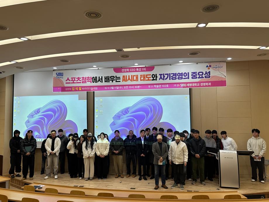 세명대학교(권동현 총장) 경영학과는 3월 11일(수) 오전 10시 30분, 학술관 102호에서 김익철 하카리더십 대표를 초청해 ‘스포츠 철학에서 배우는 AI 시대의 태도와 자기경영의 중요성’을 주제로 경영학 CEO특강을 진행하였다.