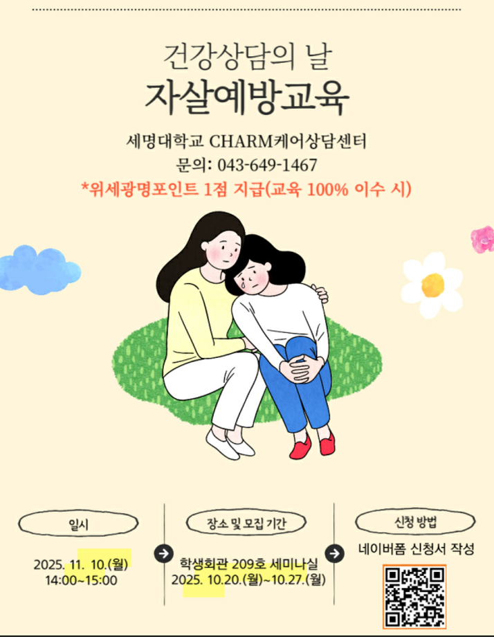 본문 시작 홈으로 학과생활 학과소개 교수소개 교과과정 학과생활 홈페이지가이드 사진게시판 공지사항 사진게시판 전공자료실 동아리 학과행사 사진게시판 페이스북 트위터 프린트 [CHARM케어상담센터] 2025학년도 2학기 자살예방교육 진행 안내 산업디자인학과 82 2025-10-21 목록 이전[긴급공지] 최근 급증 중인 '캄보디아 불법 고용, 납치' 사례 주의 안내 다음 [CHARM케어상담센터] 2025학년도 2학기 알코올중독 예방 및 스트레스 대처 관련 교육 진행 안내 담당부서 : 산업디자인학과 담당자 : 류상현 연락처 : 043-649-1436 최종수정일 : 2024-10-26 만족도조사 만족도 조사 이 페이지에서 제공하는 정보에 대하여 만족하시나요? 매우만족 만족 보통 불만족 매우불만족