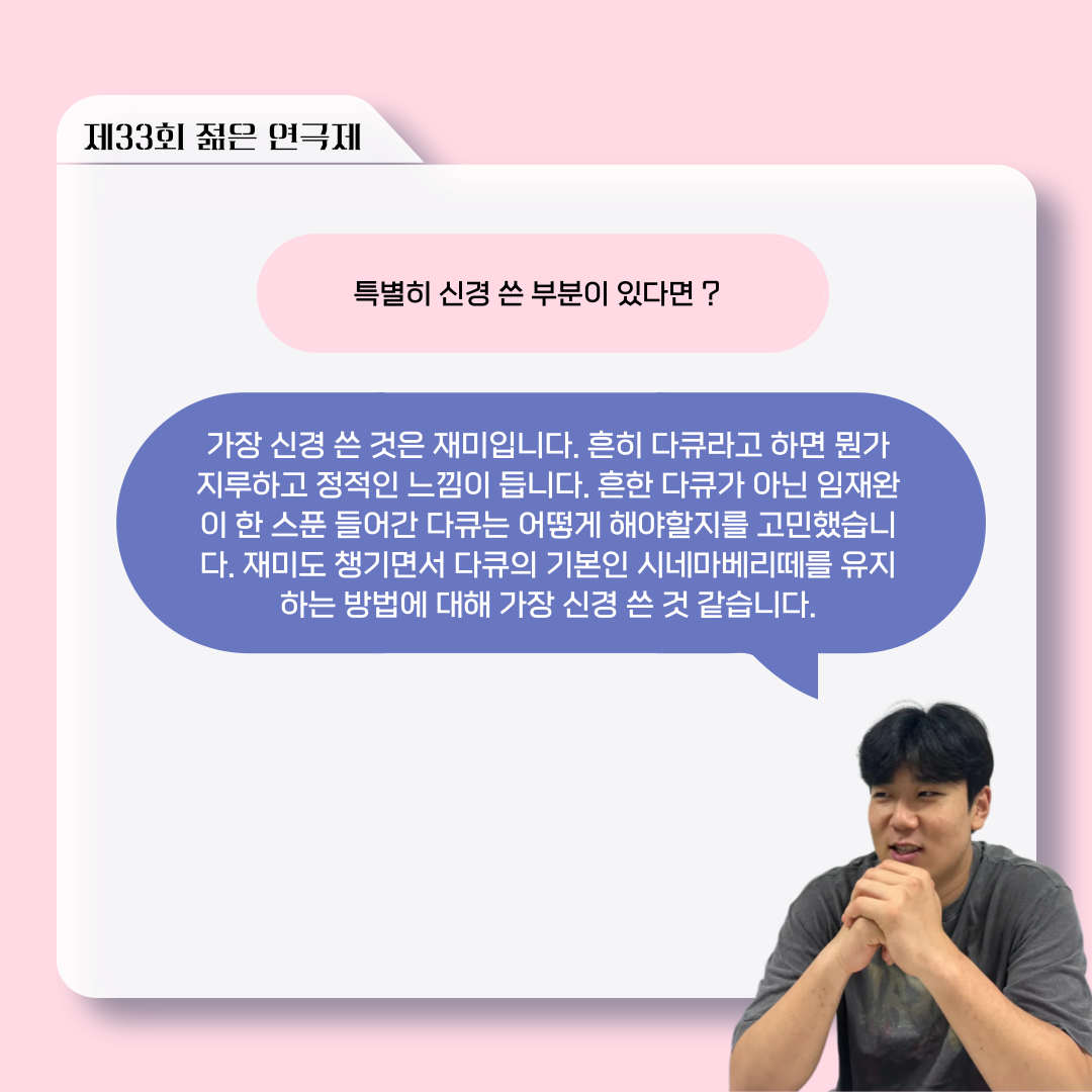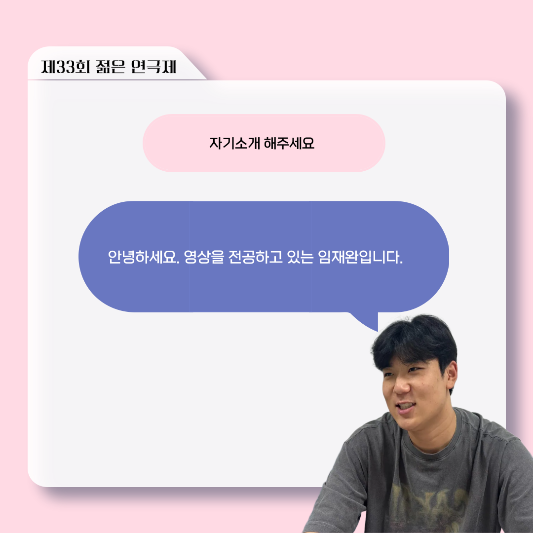학회 ‘늘’ 의 여덟 번째 인터뷰로 세명대학교 연기예술학과 젊은연극제 참가작 < 20세기 소년소녀 창가집 > 의 다큐pd 役 임재완 학우와 인터뷰 하는 시간을 가졌습니다!