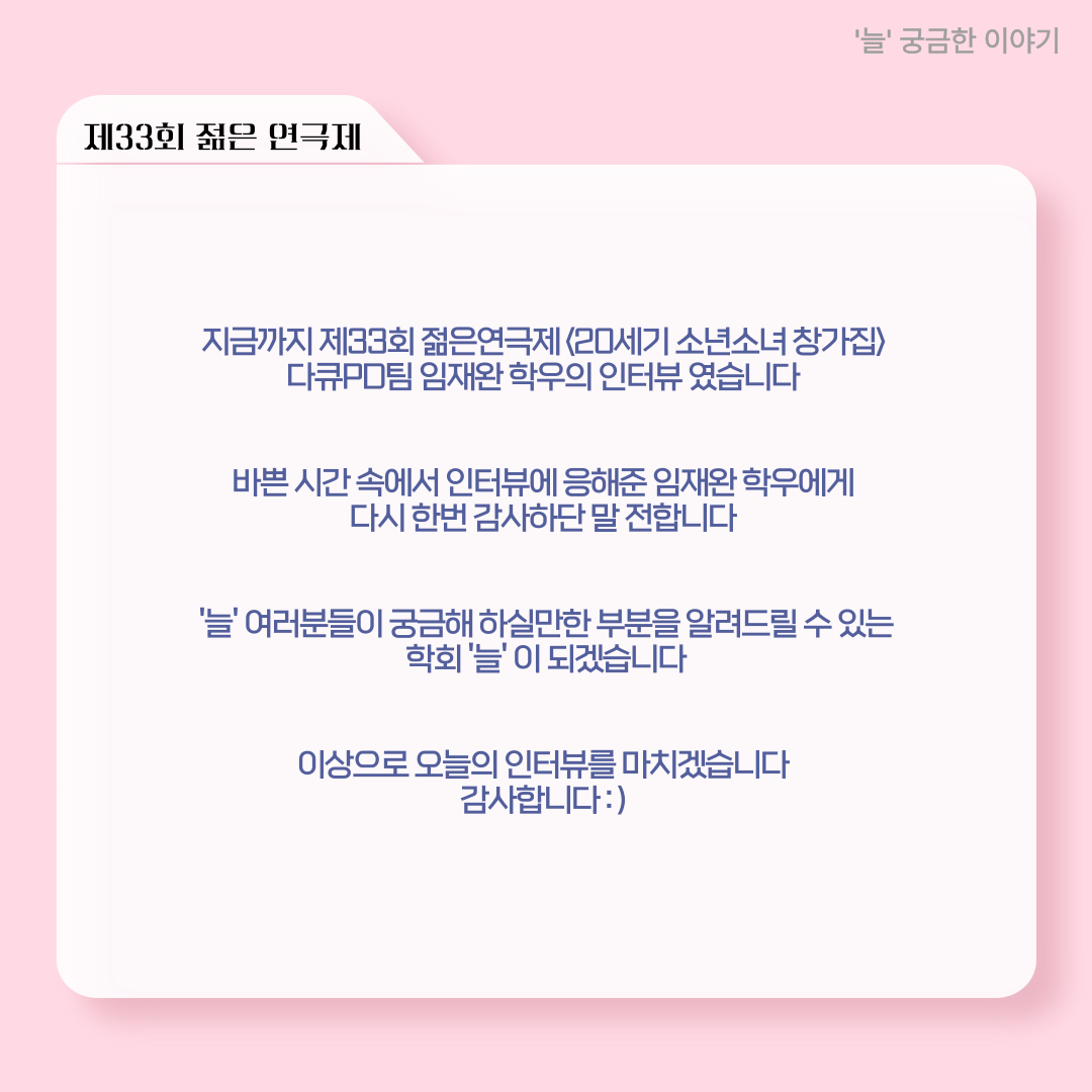 ‘늘‘ 궁금한 이야기 - 젊은연극제 ‘20세기 소년소녀 창가집’ 다큐pd 役 < 임재완 >