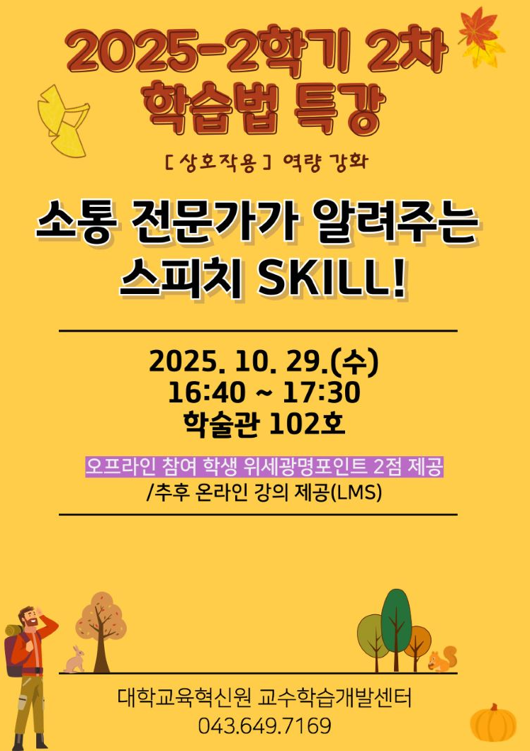 본문 시작 홈으로 커뮤니티 학부소개 진로·취업 교육과정 커뮤니티 대학원 입학상담 홈페이지가이드 공지사항 공지사항 갤러리 학생회 동문회 전공자료실 전공동아리 Youtube Instagram 공지사항 페이스북 트위터 프린트 [특강안내] 25-2학기 2차 학습법특강 시행 안내 바이오식품영양학부 조회 : 19 등록일 : 2025-10-17 목록 이전[공모안내] 2025 세명 참(CHARM)좋은경험 인재상 공모전 안내 다음 [평가안내] 2025-2학기 개설강좌 대상 중간 수업평가 참여 안내 담당부서 : 바이오식품영양학부 담당자 : 황성희 연락처 : 043-649-1578 최종수정일 : 2024-10-26 만족도조사 만족도 조사 이 페이지에서 제공하는 정보에 대하여 만족하시나요? 매우만족 만족 보통 불만족 매우불만족