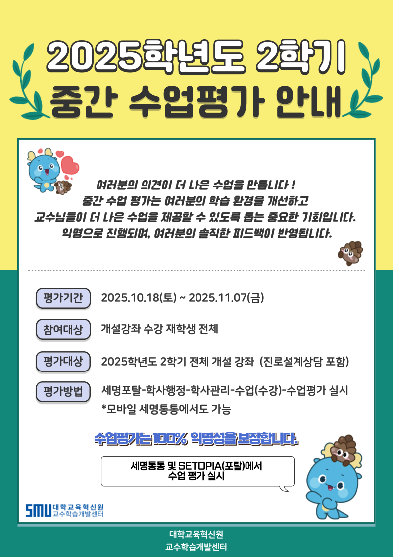 본문 시작 홈으로 커뮤니티 학부소개 진로·취업 교육과정 커뮤니티 대학원 입학상담 홈페이지가이드 공지사항 공지사항 갤러리 학생회 동문회 전공자료실 전공동아리 Youtube Instagram 공지사항 페이스북 트위터 프린트 [평가안내] 2025-2학기 개설강좌 대상 중간 수업평가 참여 안내 바이오식품영양학부 조회 : 19 등록일 : 2025-10-20 목록 이전[특강안내] 25-2학기 2차 학습법특강 시행 안내 다음 [필수교육안내] 2025학년도 사회적 장애인식개선 교육 이수 안내 담당부서 : 바이오식품영양학부 담당자 : 황성희 연락처 : 043-649-1578 최종수정일 : 2024-10-26 만족도조사 만족도 조사 이 페이지에서 제공하는 정보에 대하여 만족하시나요? 매우만족 만족 보통 불만족 매우불만족
