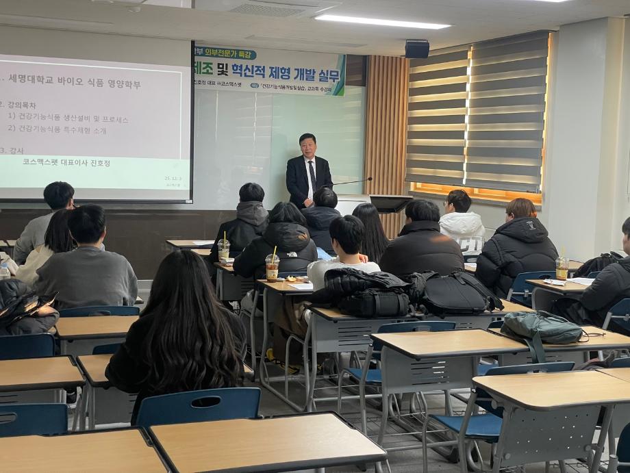 본문 시작 홈으로 커뮤니티 학부소개 진로·취업 교육과정 커뮤니티 대학원 입학상담 홈페이지가이드 갤러리 공지사항 갤러리 학생회 동문회 전공자료실 전공동아리 Youtube Instagram 갤러리 페이스북 트위터 프린트 실무체험 외부전문가 특강: 진호정 대표(코스맥스펫) 바이오식품영양학부 104 2025-12-04 실무체험교과목 "건강기능식품개발및실습" 특강 1) 강사: 진호정 대표(코스맥스펫) 2) 주제: '산업 현장에서의 건강기능식품 제조 및 혁신적 제형 개발 실무' 3) 일시 및 장소: 12월 3일, 바이오학관302호 *특강을 통해 현장 실무과 취업 및 연구동향에 대해 자세히 강의해 주신 진호정 대표님께 감사드립니다. 목록 이전2025 자기설계 해외배낭연수(7/8~7/15, 호주) 담당부서 : 바이오식품영양학부 담당자 : - 연락처 : 043-649-1578 최종수정일 : 2024-10-26 만족도조사 만족도 조사 이 페이지에서 제공하는 정보에 대하여 만족하시나요? 매우만족 만족 보통 불만족 매우불만족