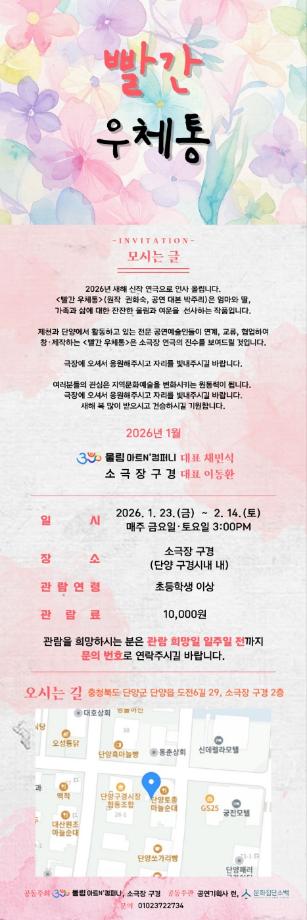 본문 시작 홈으로 MCC News 학과소개 교수소개 학과과정 MCC News MCC SNS 홈페이지가이드 교수 및 졸업생 학과 및 재학생 교수 및 졸업생 미디어 정보통 교수 및 졸업생 페이스북 트위터 프린트 권화숙 교수님 희곡 빨간우체통 공연 안내 미디어콘텐츠창작학과 208 2026-01-16 권화숙 교수님께서 작성하신 희곡 작품 '빨간우체통'이 연극무대에 올려지게 되었습니다. 자세한 내용은 위 사진을 참고해주시면 됩니다. 목록 이전권화숙 교수님 향기로운 삶, 문인화 전시회 안내 담당부서 : 미디어콘텐츠창작학과 담당자 : - 연락처 : 043-649-1741 최종수정일 : 2024-10-26 만족도조사 만족도 조사 이 페이지에서 제공하는 정보에 대하여 만족하시나요? 매우만족 만족 보통 불만족 매우불만족