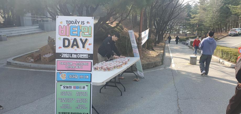 본문 시작 홈으로 학부활동 학부소개 학부활동 교육과정 커뮤니티 학부생활 입학안내 홈페이지가이드 학부행사 학부행사 학생회 활동 전공 동아리 학부갤러리 학부행사 페이스북 트위터 프린트 🍎과일 나눔 이벤트 비타민 DAY🍋🟩 컴퓨터학부 15 2026-03-24 2026년 3월 24일 화요일 🍊🍎 재학생 여러분의 건강 증진과 학교 생활 만족도를 높이고, 든든하게 채우기 위해 특별한 시간을 준비했습니다! , 과일 나눔 이벤트 **“비타민 DAY”**를 진행했어요 ✨ 신선한 과일과 함께 잠시나마 바쁜 일상 속에서 여유를 느끼고, 웃음과 활력을 나누는 시간이 되었길 바랍니다 😊 목록 이전대한전자공학회 2025 추계학술대회 참여 만족도조사 만족도 조사 이 페이지에서 제공하는 정보에 대하여 만족하시나요? 매우만족 만족 보통 불만족 매우불만족