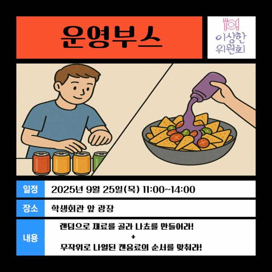 본문 시작 홈으로 공지사항 학생위원회 개요 학생위원회 소개 공지사항 활동결과 홈페이지가이드 프로그램 계획 프로그램 계획 세명대학교 공지사항 프로그램 계획 페이스북 트위터 프린트 [이상한 위원회] 유쾌하거나 불쾌하거나 학생처 119 2025-09-25 안녕하세요 🍽 이상한 위원회 🍽 입니다 청룡체전 기간 중 이상한 위원회에서 나쵸 만들기와 캔 위치 맞히기 게임을 진행하는 홍보 부스를 운영합니다! 🍭 이상한 위원회 인스타도 팔로우 하고 재미있는 경험하고 가세요🤗 ✅ 선착순 150명 ✅ 일시: 2025. 9. 25.(목) ✅ 시간: 11시~14시 ✅ 장소: 학생회관 앞 광장 많은 참여와 관심 부탁드립니다❤ 목록 이전[용감한 창업자] 어떤 향이 좋아? 이전[밀어주는 위원회] 너의 꿈, 우리가 밀어줄게! 담당부서 : 장학복지팀 담당자 : 김효정 연락처 : 043-649-1142 최종수정일 : 2024-10-26 만족도조사 만족도 조사 이 페이지에서 제공하는 정보에 대하여 만족하시나요? 매우만족 만족 보통 불만족 매우불만족