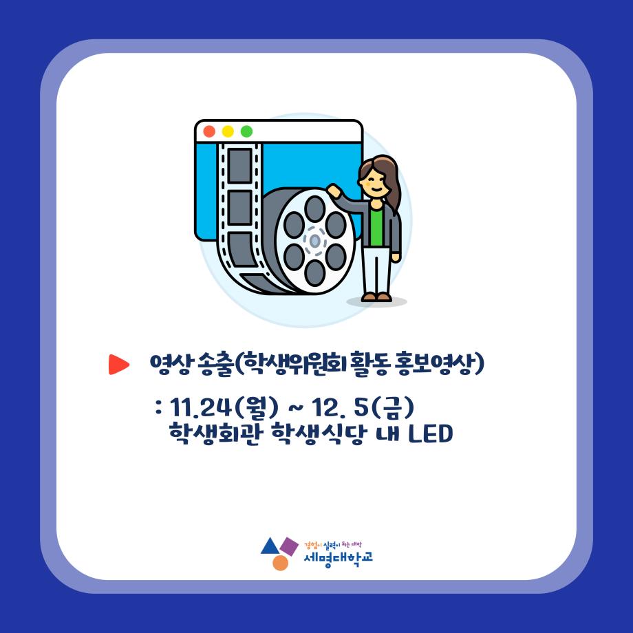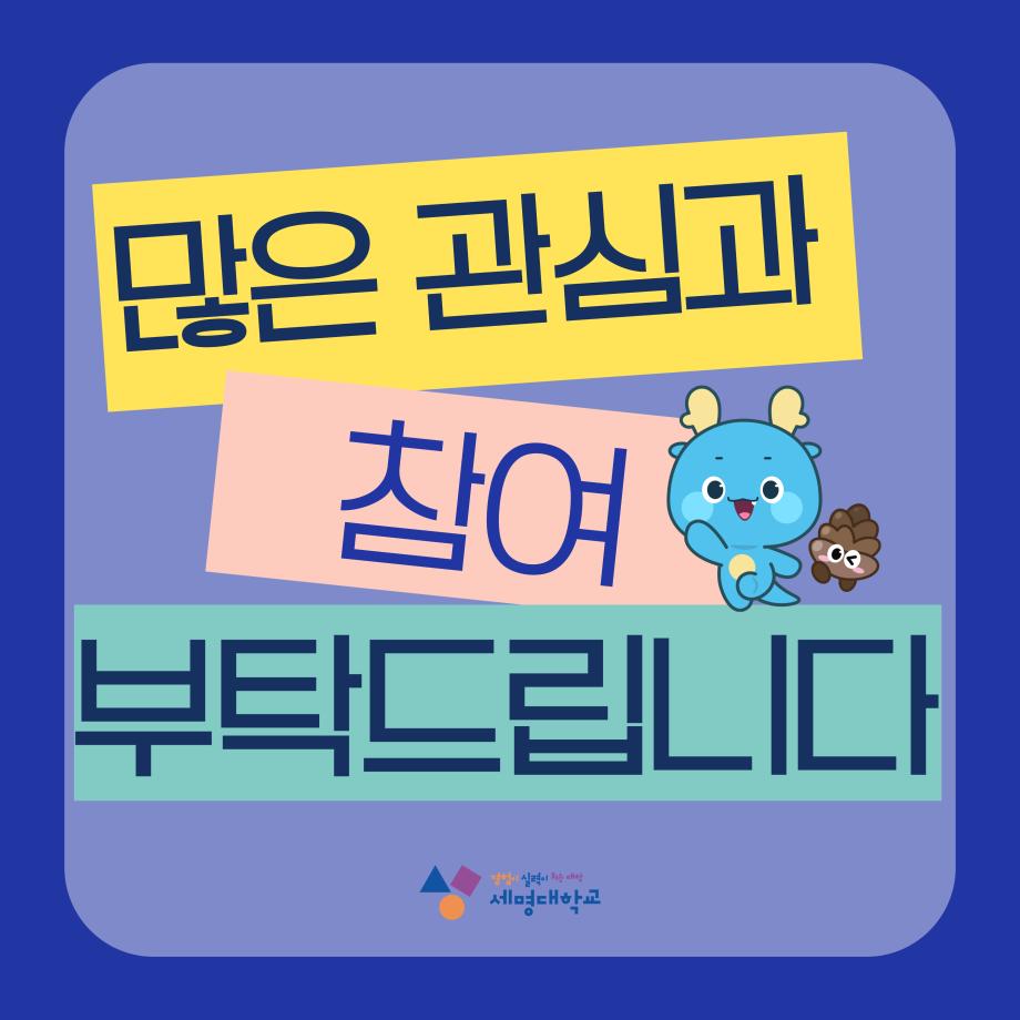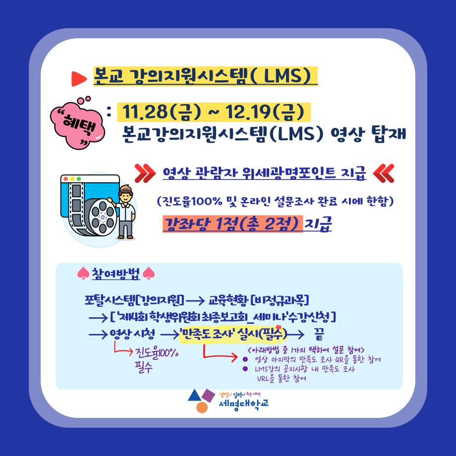 본문 시작 홈으로 공지사항 학생위원회 개요 학생위원회 소개 공지사항 활동결과 홈페이지가이드 프로그램 계획 프로그램 계획 세명대학교 공지사항 프로그램 계획 페이스북 트위터 프린트 제 4회 학생위원회 최종보고회 시행 학생처 271 2025-11-20 <제 4회 학생위원회 최종보고회 안내> 1. 최종보고회 세미나 영상시청 가. 일정: 2025.11.28(금) ~ 12.19(금) 나. 방법: 본교 강의지원시스템(lms) 수강신청 후 영상관람 다. 혜택: 강좌당 위세광명포인트 1점 (총 2개 강좌) 2. 학생위원회 활동홍보 영상송출 가. 일정: 2025. 11. 24(금) ~ 12.5(금) 나. 방법: 학생회관 학생식당 내 설치 LED를 통한 영상송출 목록 이전[맛있는 위원회] 숨터에 놀러오세요 담당부서 : 장학복지팀 담당자 : - 연락처 : 043-649-1142 최종수정일 : 2024-10-26 만족도조사 만족도 조사 이 페이지에서 제공하는 정보에 대하여 만족하시나요? 매우만족 만족 보통 불만족 매우불만족