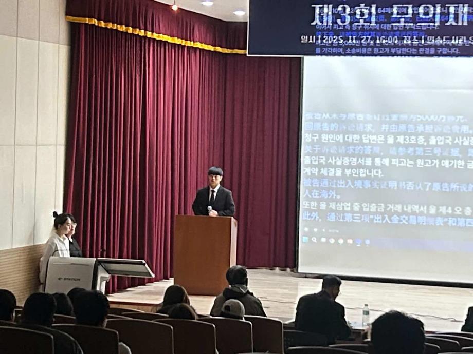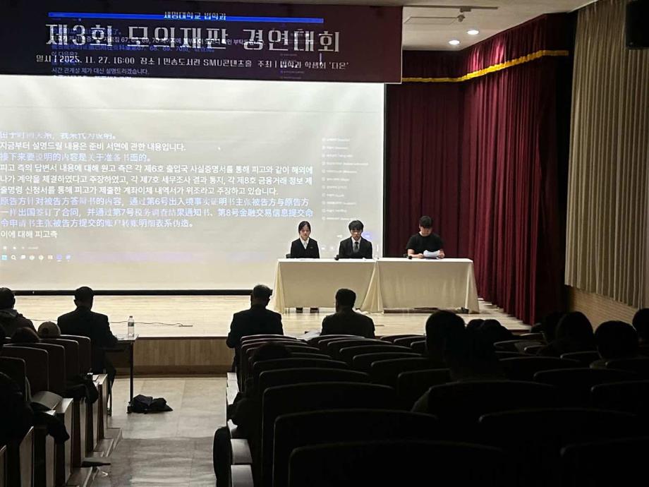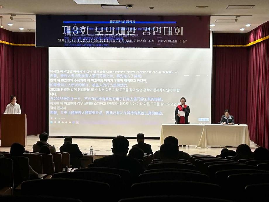 본문 시작 홈으로 커뮤니티 학과안내 교수소개 학과과정 커뮤니티 홈페이지가이드 학과행사 공지사항 취업정보 학과사진첩 학과행사 동아리 학생회 교우소식 모의재판 모의재판 법학학술캠프 법학학술특강 모의재판 페이스북 트위터 프린트 2025학년도 제3회 법학과 모의재판 경연대회 법학과 132 2025-12-17 2025년 11월 27일 민송도서관 1층 콘텐츠홀에서 법학과 모의재판 경연대회 진행하였습니다. 참여하신 모든 분들 고생 많으셨습니다. 목록 이전제2회 모의재판 경영대회 담당부서 : 법학과 담당자 : - 연락처 : 043-649-1764 최종수정일 : 2024-10-26 만족도조사 만족도 조사 이 페이지에서 제공하는 정보에 대하여 만족하시나요? 매우만족 만족 보통 불만족 매우불만족