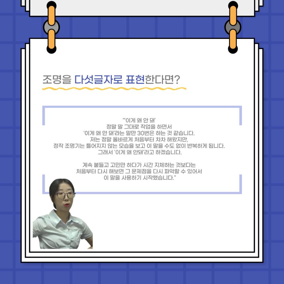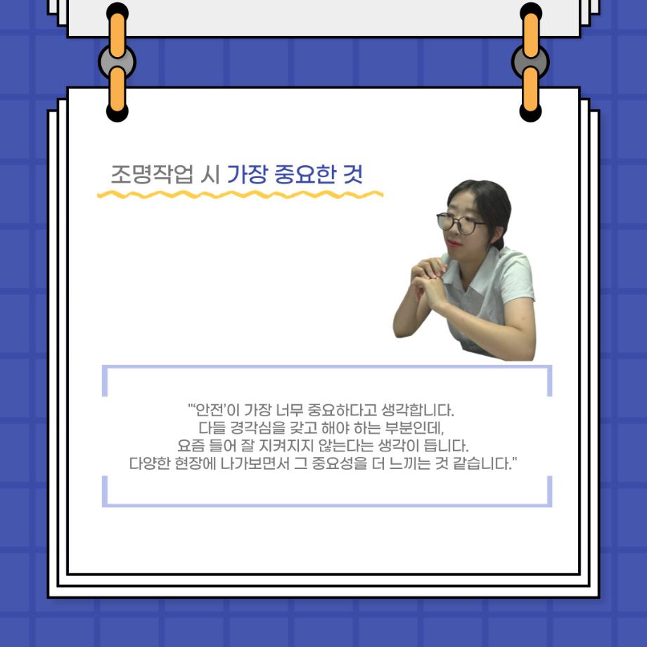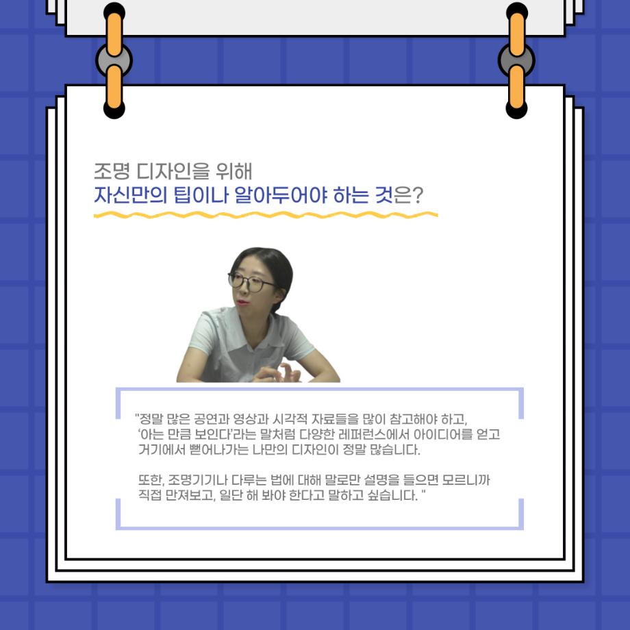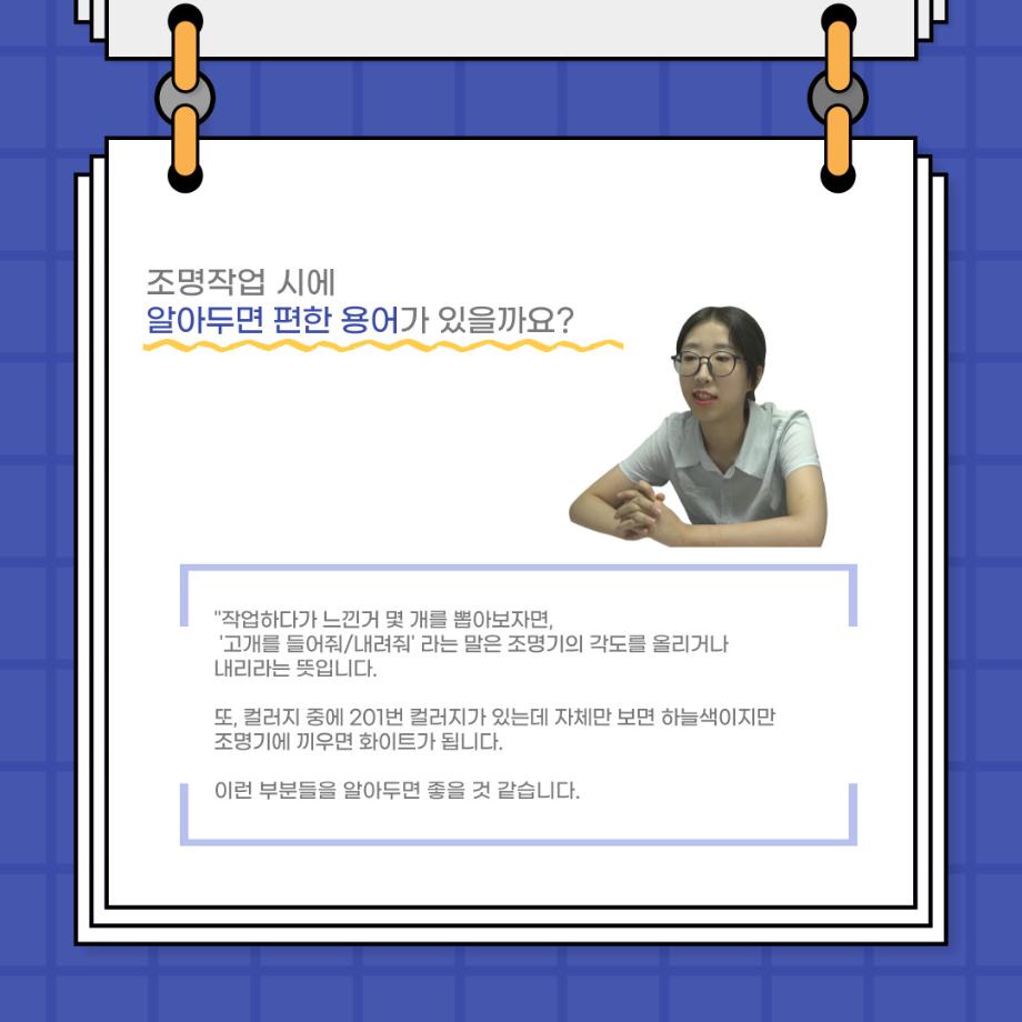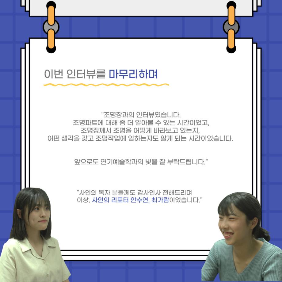 본문 시작 홈으로 커뮤니티 학과소개 입학정보 교수소개 학과과정 커뮤니티 공연예매 안내 홈페이지가이드 포토갤러리 공지사항 포토갤러리 작품DB 동아리 학사일정 학생회 포토갤러리 페이스북 트위터 프린트 사이와의 인터뷰 - 23년도 조명장 ‘김은경‘ 연기예술학과 3623 2023-07-10 안녕하십니까. 23년도 학회 ‘사이’입니다. 학회 ‘사이’의 두번째 인터뷰로 연기예술학과 23년도 조명장인 김은경 학생과 인터뷰하는 시간을 가졌습니다. 이번 인터뷰에서는 조명에 대한 매력과 조명 작업에서 가장 중요한 것, 조명 작업에서 알아두어야 하는 것 등에 대해 인터뷰하였습니다. 다음 인터뷰 컨텐츠 ‘사인’도 많은 사랑 부탁드립니다. 목록 이전2023학년도「전과자문단」운영 안내 다음 이지은 교수님 연출작품 <1923년생 조선인 최영우> 담당부서 : 연기예술학과 담당자 : - 연락처 : 043-649-1733 최종수정일 : 2024-10-26 만족도조사 만족도 조사 이 페이지에서 제공하는 정보에 대하여 만족하시나요? 매우만족 만족 보통 불만족 매우불만족