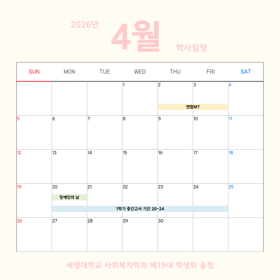 본문 시작 홈으로 커뮤니티 학과소개 교수소개 교육과정 현장실습 및 취업정보 커뮤니티 홈페이지가이드 학사일정 학과공지 학사일정 학생회 동아리 학생 소통 광장 포토갤러리 전공자료실 서식자료실 학사일정 페이스북 트위터 프린트 4월 학사 일정 사회복지학과 59 2026-04-06 4월 학사 일정입니다. 목록 이전3월 학사 일정 담당부서 : 사회복지학과 담당자 : - 연락처 : 043-649-1799 최종수정일 : 2024-10-26 만족도조사 만족도 조사 이 페이지에서 제공하는 정보에 대하여 만족하시나요? 매우만족 만족 보통 불만족 매우불만족