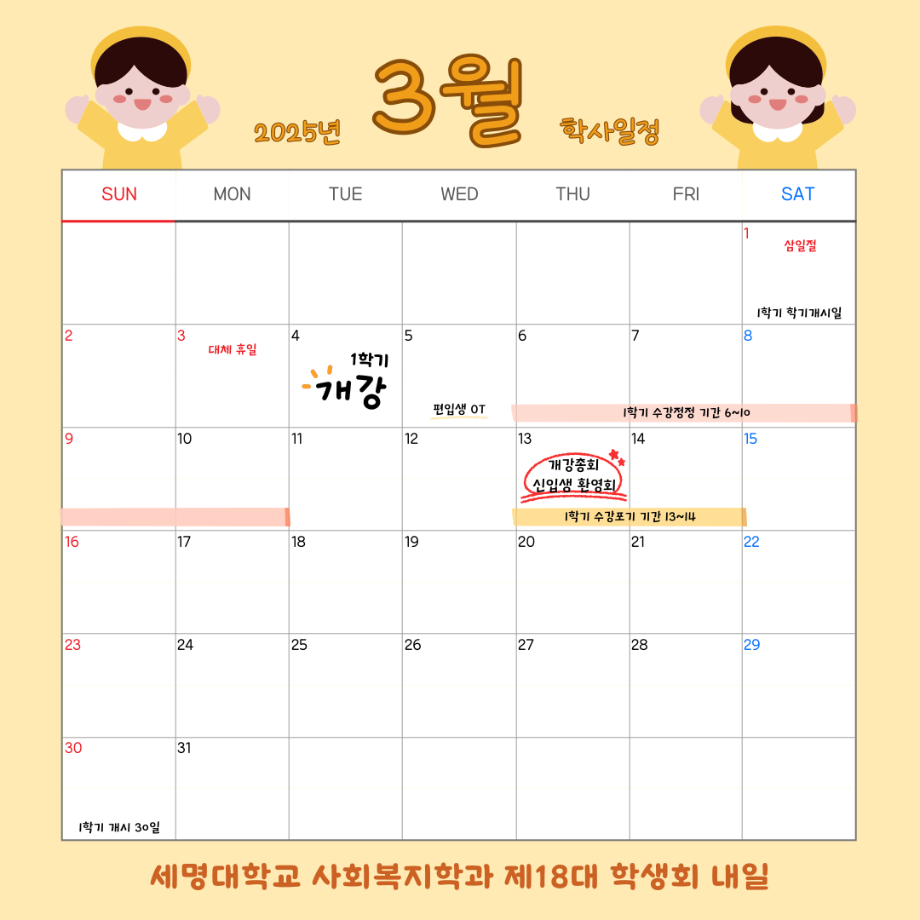 본문 시작 홈으로 커뮤니티 학과소개 교수소개 교육과정 현장실습 및 취업정보 커뮤니티 홈페이지가이드 학사일정 학과공지 학사일정 학생회 동아리 학생 소통 광장 포토갤러리 전공자료실 서식자료실 학사일정 페이스북 트위터 프린트 3월 학사 일정 사회복지학과 677 2025-09-04 2025학년도 3월 학사 일정입니다. 목록 다음 4월 학사 일정 담당부서 : 사회복지학과 담당자 : - 연락처 : 043-649-1799 최종수정일 : 2024-10-26 만족도조사 만족도 조사 이 페이지에서 제공하는 정보에 대하여 만족하시나요? 매우만족 만족 보통 불만족 매우불만족