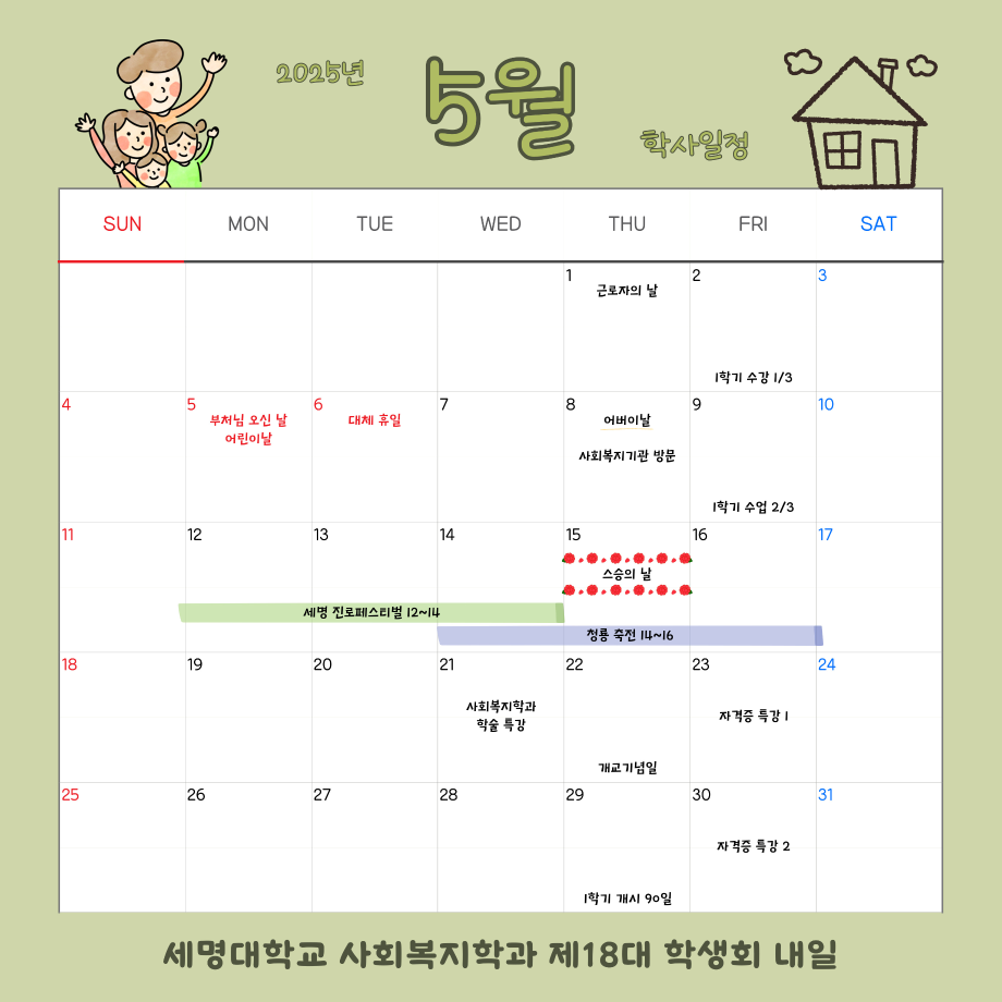 본문 시작 홈으로 커뮤니티 학과소개 교수소개 교육과정 현장실습 및 취업정보 커뮤니티 홈페이지가이드 학사일정 학과공지 학사일정 학생회 동아리 학생 소통 광장 포토갤러리 전공자료실 서식자료실 학사일정 페이스북 트위터 프린트 5월 학사 일정 사회복지학과 582 2025-09-04 2025학년도 5월 학사 일정입니다. 목록 이전4월 학사 일정 다음 6월 학사 일정 담당부서 : 사회복지학과 담당자 : - 연락처 : 043-649-1799 최종수정일 : 2024-10-26 만족도조사 만족도 조사 이 페이지에서 제공하는 정보에 대하여 만족하시나요? 매우만족 만족 보통 불만족 매우불만족