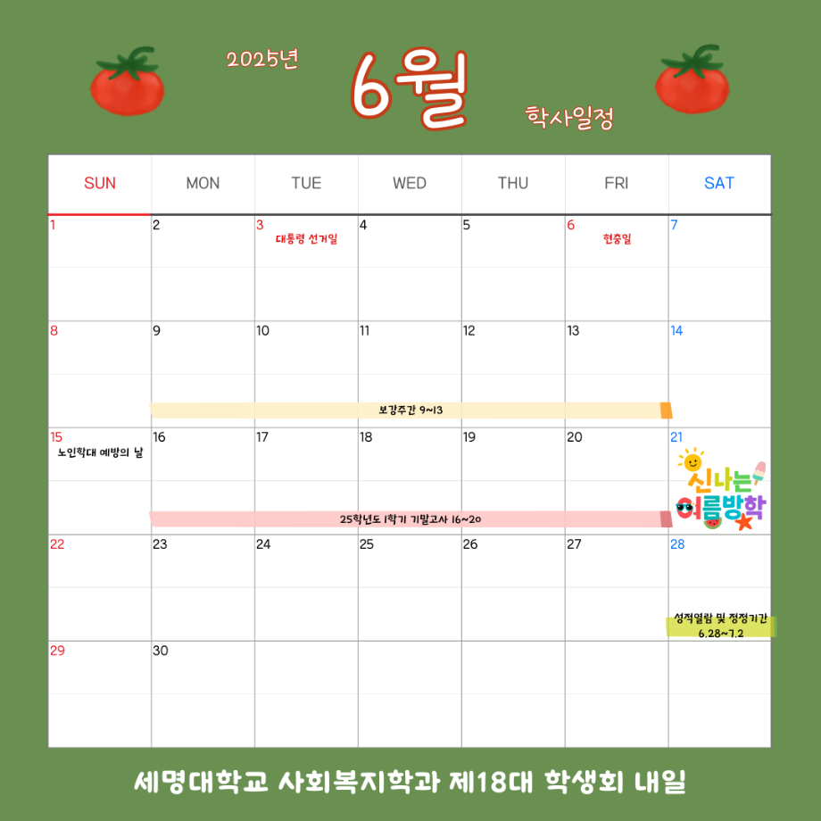 본문 시작 홈으로 커뮤니티 학과소개 교수소개 교육과정 현장실습 및 취업정보 커뮤니티 홈페이지가이드 학사일정 학과공지 학사일정 학생회 동아리 학생 소통 광장 포토갤러리 전공자료실 서식자료실 학사일정 페이스북 트위터 프린트 6월 학사 일정 사회복지학과 598 2025-09-04 2025학년도 6월 학사 일정입니다. 목록 이전5월 학사 일정 다음 8월 학사 일정 담당부서 : 사회복지학과 담당자 : - 연락처 : 043-649-1799 최종수정일 : 2024-10-26 만족도조사 만족도 조사 이 페이지에서 제공하는 정보에 대하여 만족하시나요? 매우만족 만족 보통 불만족 매우불만족