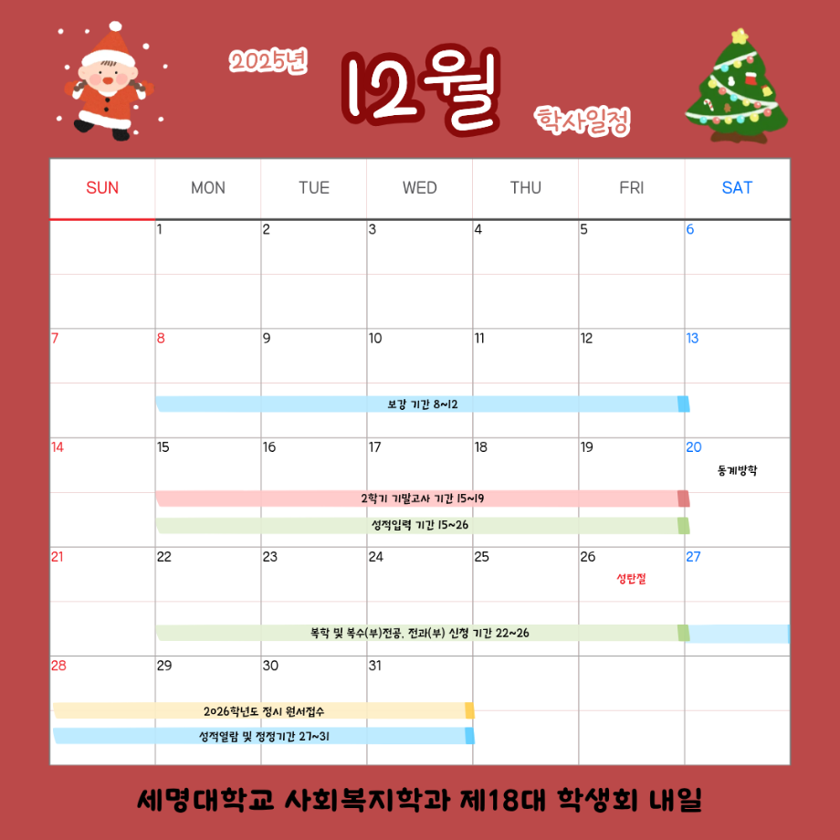 본문 시작 홈으로 커뮤니티 학과소개 교수소개 교육과정 현장실습 및 취업정보 커뮤니티 홈페이지가이드 학사일정 학과공지 학사일정 학생회 동아리 학생 소통 광장 포토갤러리 전공자료실 서식자료실 학사일정 페이스북 트위터 프린트 12월 학사 일정 사회복지학과 462 2025-12-03 12월 학사 일정 입니다. 목록 이전11월 학사 일정 다음 2월 학사 일정 담당부서 : 사회복지학과 담당자 : - 연락처 : 043-649-1799 최종수정일 : 2024-10-26 만족도조사 만족도 조사 이 페이지에서 제공하는 정보에 대하여 만족하시나요? 매우만족 만족 보통 불만족 매우불만족