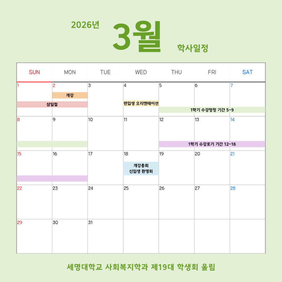 본문 시작 홈으로 커뮤니티 학과소개 교수소개 교육과정 현장실습 및 취업정보 커뮤니티 홈페이지가이드 학사일정 학과공지 학사일정 학생회 동아리 학생 소통 광장 포토갤러리 전공자료실 서식자료실 학사일정 페이스북 트위터 프린트 3월 학사 일정 사회복지학과 271 2026-03-04 3월 학사 일정입니다. 목록 이전2월 학사 일정 다음 4월 학사 일정 담당부서 : 사회복지학과 담당자 : - 연락처 : 043-649-1799 최종수정일 : 2024-10-26 만족도조사 만족도 조사 이 페이지에서 제공하는 정보에 대하여 만족하시나요? 매우만족 만족 보통 불만족 매우불만족