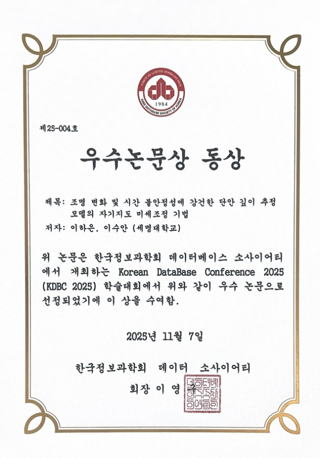 세명대학교 컴퓨터학부는 데이터지능연구실(Data Intelligence Lab) 소속 이하은 학생(컴퓨터학부 3학년)과 지도교수인 이수안 학부장(데이터지능연구실 담당 교수)으로 구성된 연구팀이, 한국정보과학회 데이터소사이어티가 주관한 2025년도 한국 데이터베이스 컨퍼런스(KDBC 2025)에서 우수논문상 동상을 수상하는 쾌거를 이루었다고 밝혔습니다.