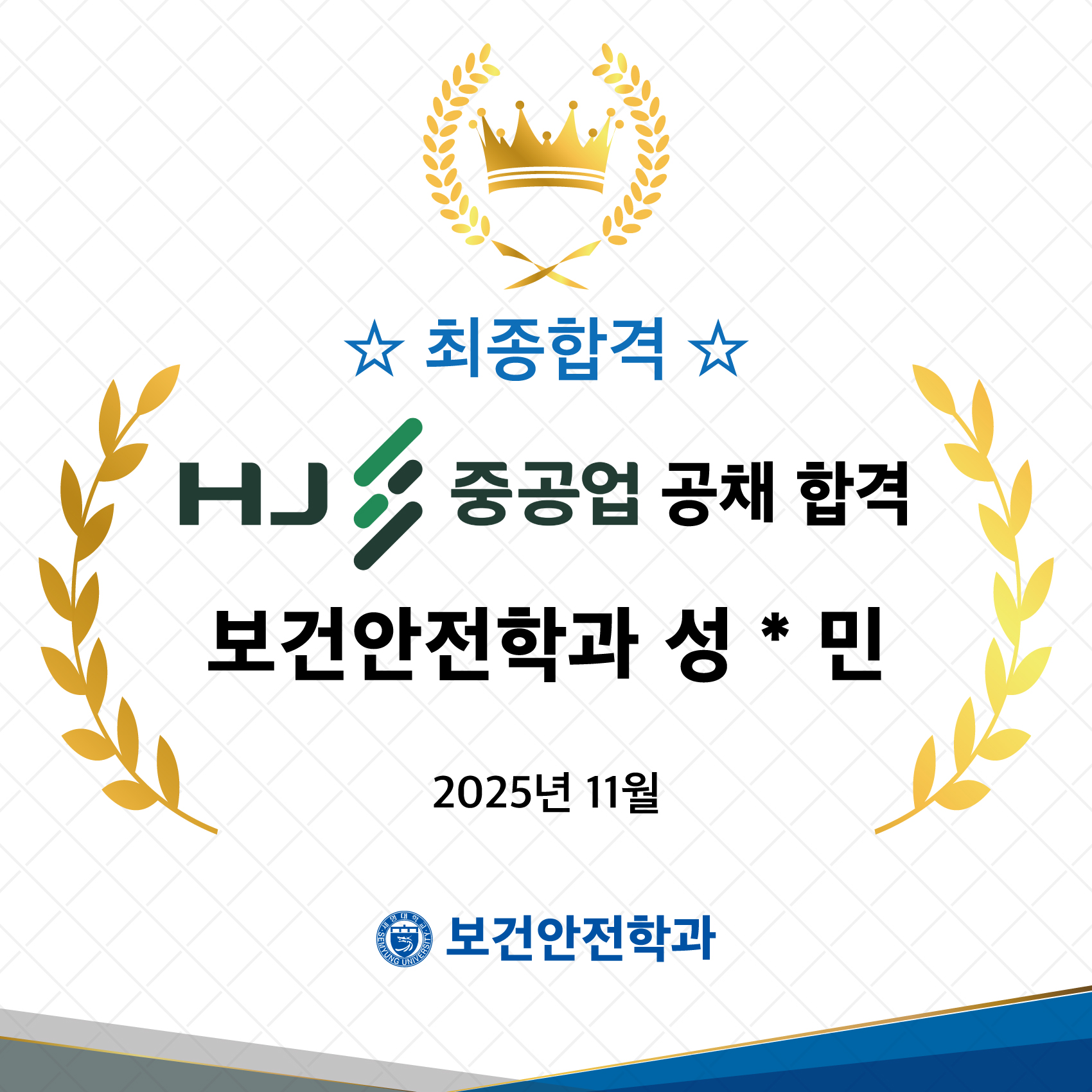 본문 시작 홈으로 커뮤니티 학과소개 진로 및 취업 교수소개 학과과정 커뮤니티 홈페이지가이드 학과공지 학과공지 학사일정 포토갤러리 학생회 학과영상 보건안전학과 인스타 보건안전학과 블로그 학과공지 페이스북 트위터 프린트 2025년 HJ중공업(한진중공업) 공채 합격을 축하합니다! 보건안전학과 조회 : 62 등록일 : 2026-01-09 2025년 HJ중공업(한진중공업) 공채 합격을 축하합니다! 목록 이전24-25년 보건안전학과 자격증 취득을 축하합니다! 다음 2025년 7급 공무원 최종 합격 축하 담당부서 : 보건안전학과 담당자 : - 연락처 : 043-649-1777 최종수정일 : 2024-10-26 만족도조사 만족도 조사 이 페이지에서 제공하는 정보에 대하여 만족하시나요? 매우만족 만족 보통 불만족 매우불만족