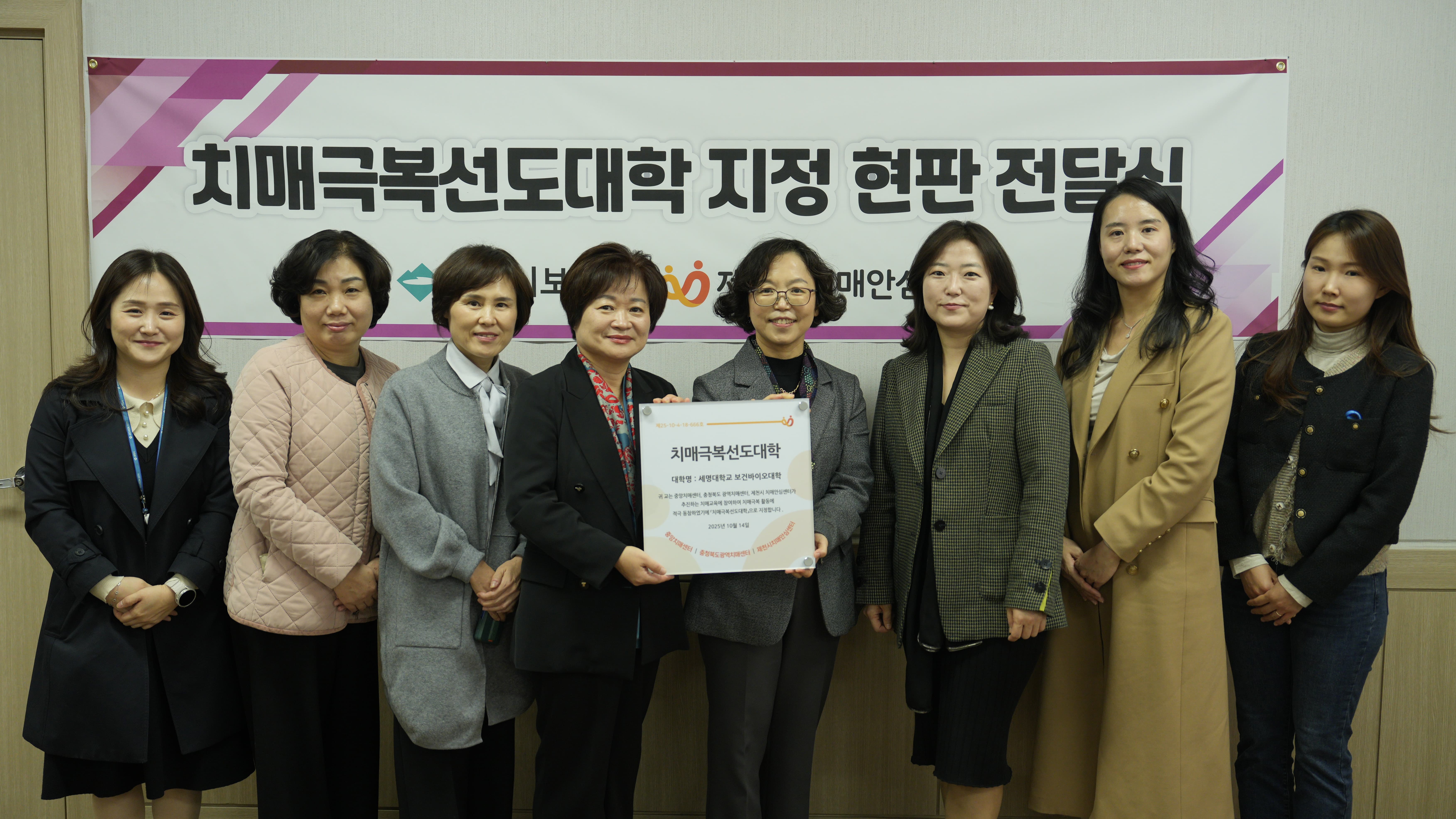 세명대학교 보건바이오대학이 제천시 1호 ‘치매극복선도대학’으로 지정되어 지난 30일 세명대학교 이학관에서 현판 전달식이 진행되었다. ✨