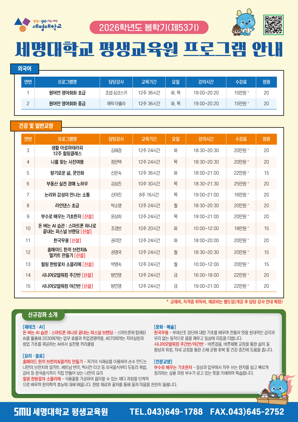 신규 강좌 : 부수로 배우는 기초한자 / 돈 버는 AI 습관 : 스마트폰 하나로 끝내는 퍼스널 브랜딩 / 한국무용 / 홈메이드 한끼 브런치&밀키트 만들기 / 힐링 한방꽃차 소믈리에 / 시니어모델워킹 주간반 / 시니어모델워킹 야간반