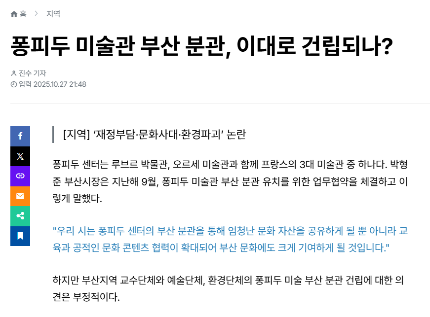 하지만 부산지역 교수단체와 예술단체, 환경단체의 퐁피두 미술관 부산 분관 건립에 대한 의견은 부정적이다.