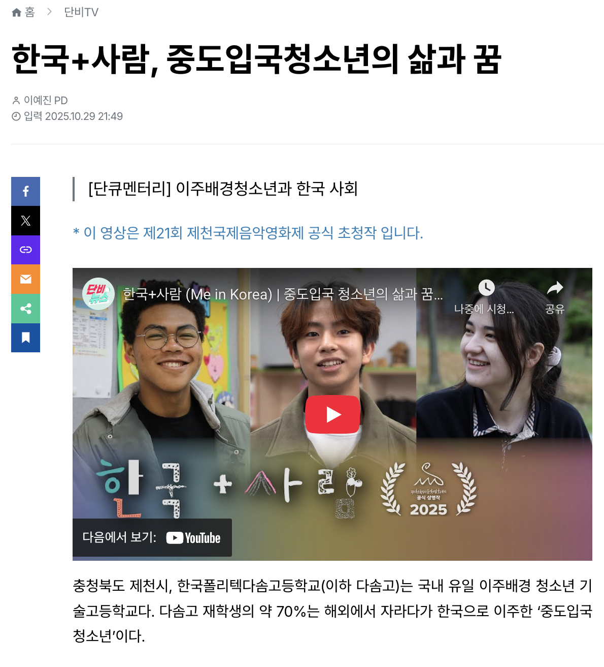 충청북도 제천시에는 전국 유일의 이주배경 청소년 기술고등학교가 있다.