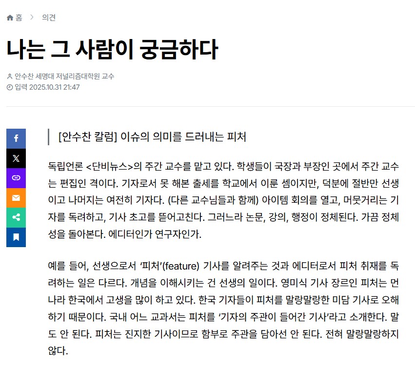 독립언론 <단비뉴스>의 주간 교수를 맡고 있다. 학생들이 국장과 부장인 곳에서 주간 교수는 편집인 격이다. 기자로서 못 해본 출세를 학교에서 이룬 셈이지만, 덕분에 절반만 선생이고 나머지는 여전히 기자다. (다른 교수님들과 함께) 아이템 회의를 열고, 머뭇거리는 기자를 독려하고, 기사 초고를 뜯어고친다. 그러느라 논문, 강의, 행정이 정체된다. 가끔 정체성을 돌아본다. 에디터인가 연구자인가.
