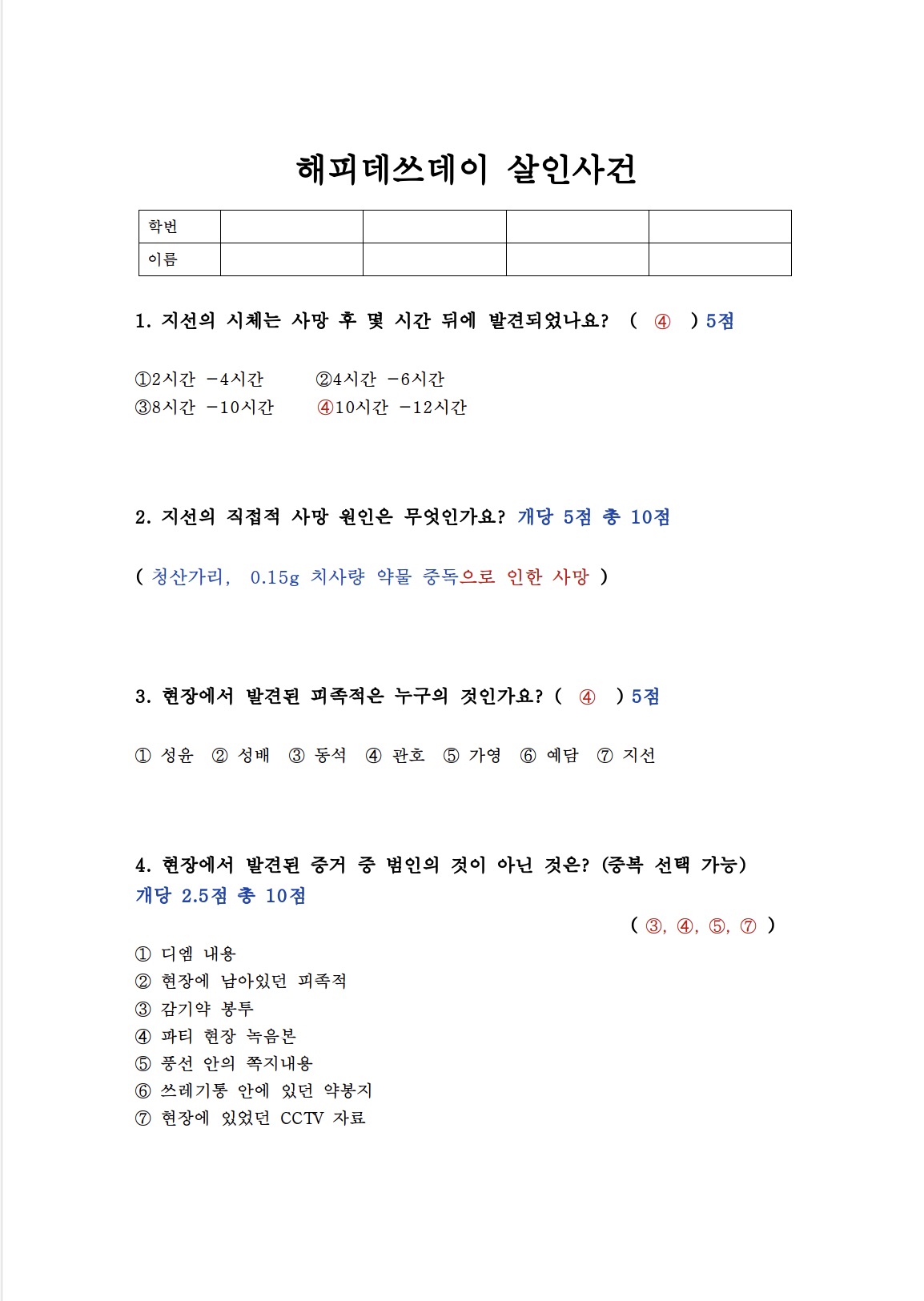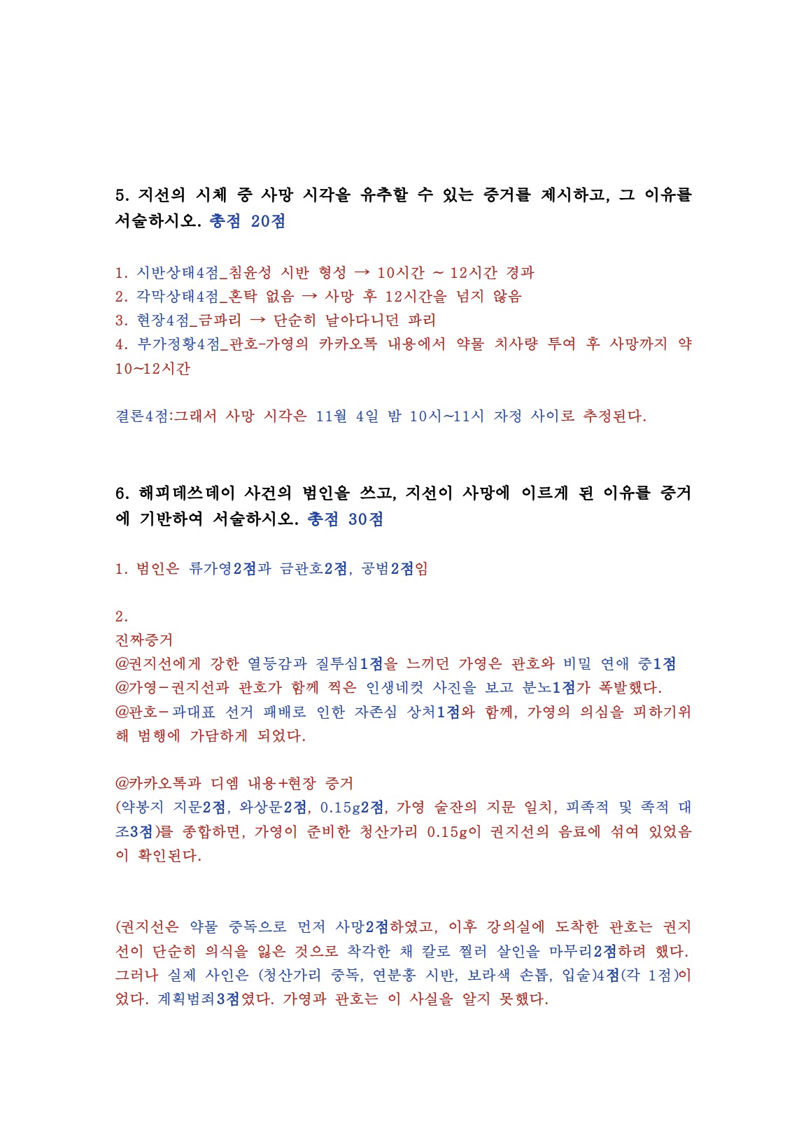 카카오톡•DM 내용, 약봉지와 술잔의 지문 일치로 가영의 관여가 확 인되며, 금관호의 현장 존재가입증됩니다.(3번 해설을 참고) 결정적 사인은 청산가리 약물중독이고(2번 해설을 참고), 금관호는 피해자가 의식을 잃은 것으로 착각하고 칼로 찔러 범행을 마무리했 습니다.