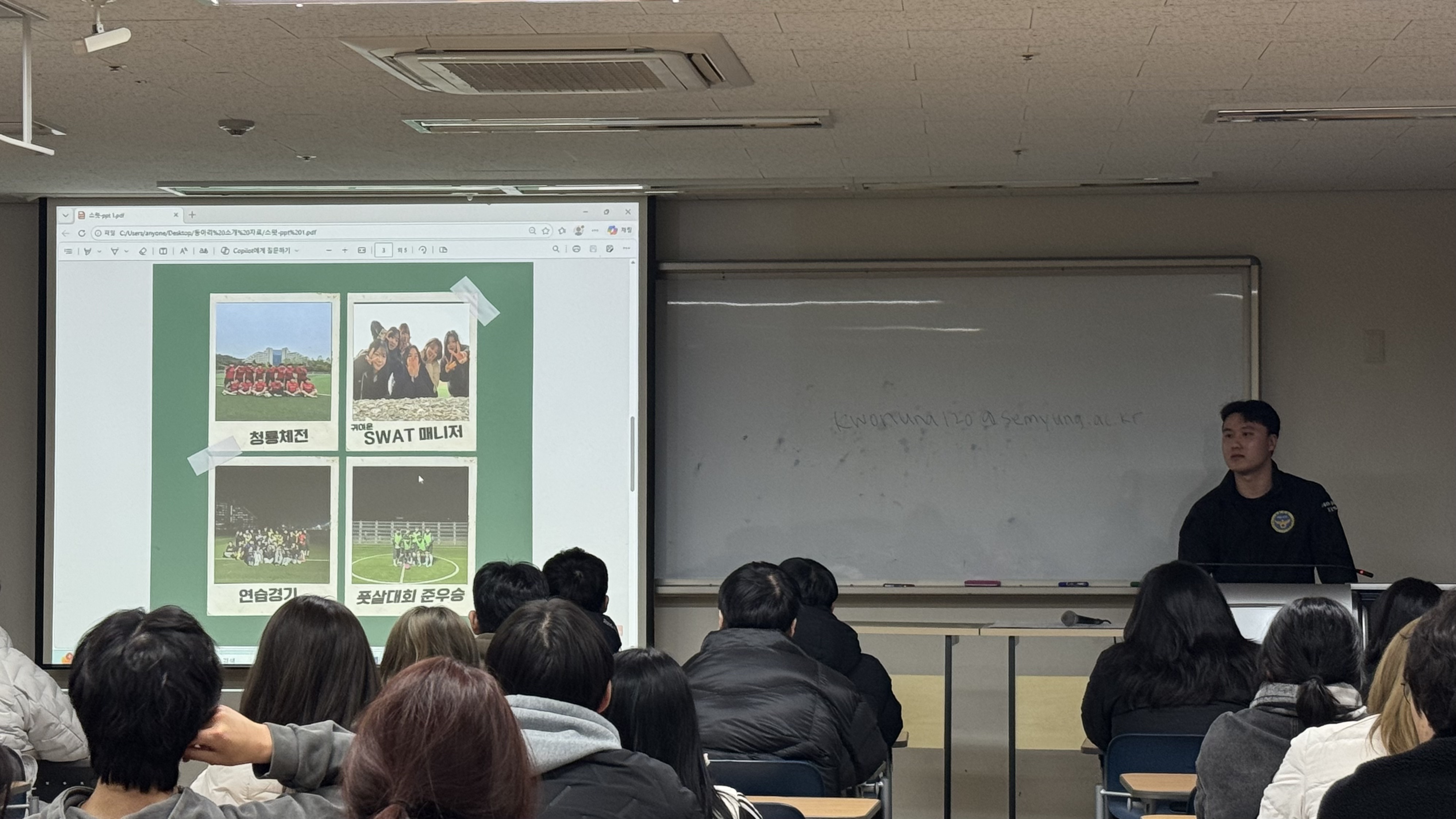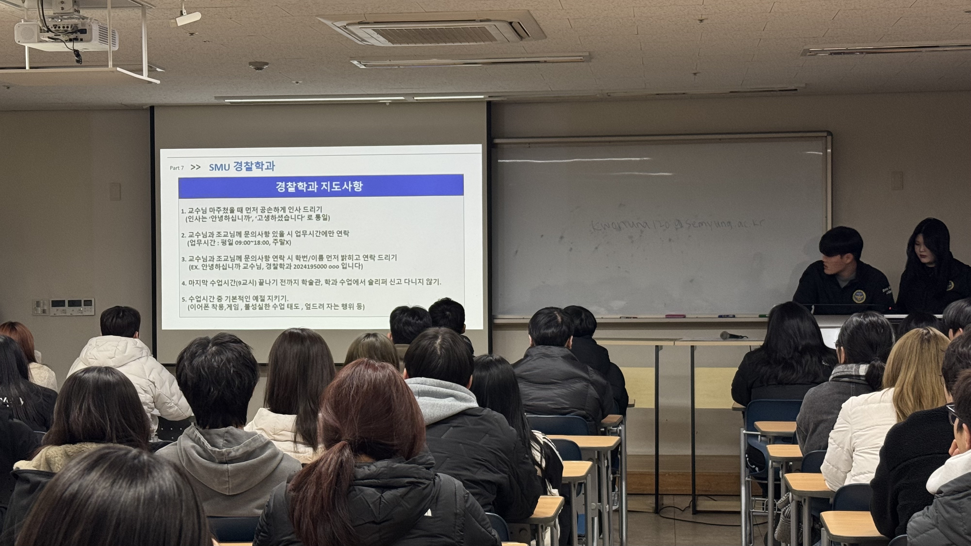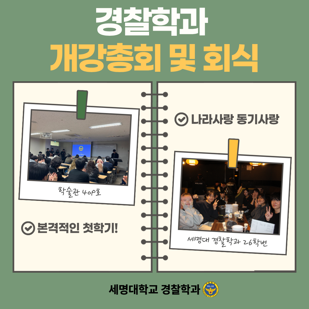 본문 시작 홈으로 커뮤니티 학과소개 교수소개 학과과정 커뮤니티 홈페이지가이드 학부공지 학부공지 학과일정 포토갤러리 학생회 동아리 학부공지 페이스북 트위터 프린트 2026 경찰학과 개강총회 및 회식 경찰학과 조회 : 287 등록일 : 2026-03-12 안녕하십니까. 세명대학교 경찰학과 제24대 학생회 ‘휘연‘입니다. 지난 3월 11일 18시 30분, 학술관 409호에서 학우분들의 원활한 학교 생활과 학우 간 친목을 위하여 개강총회를 진행하였습니다. 개강총회 이후 19시 30분부터 ‘와락’에서 개강총회 회식을 진행하였습니다. 기타 문의 사항은 연락해 주시면 답변해 드리겠습니다. 목록 이전[특강 안내] 현직자 실무경험 공유 ‘청년멘토특강(경찰관)’ 안내 다음 현직자 실무경험 공유특강 ‘청년멘토특강’ - 경찰관 만족도조사 만족도 조사 이 페이지에서 제공하는 정보에 대하여 만족하시나요? 매우만족 만족 보통 불만족 매우불만족