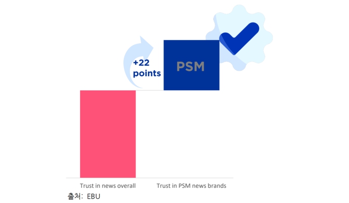"EBU(European Broadcasting Union)가 지난 9월 미디어 신뢰도 조사 보고서(TRUST IN MEDIA: PUBLIC SERVICE MEDIA AS ISLANDS OF TRUST)를 발표했다.1) 조사 결과, 대부분 유럽 국가 및 EU에서는 공영방송(Public Service Media) 뉴스가 가장 신뢰받는 뉴스로 평가되었다. 공영방송 뉴스는 유럽 33개 미디어 시장 중 91%(30개국)에서 가장 신뢰받는 뉴스로 꼽았으며, EU 27개국 미디어 시장의 86%에서는 15~24세 청년층이 신뢰하는 뉴스 출처 상위 2위 안에 들었다."