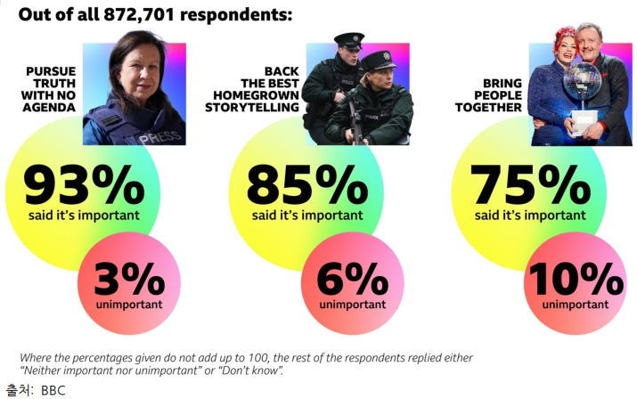 BBC가 사상 최대 규모로 수행한 시청자 대상 설문조사 결과, 응답자의 83%는 앞으로도 ‘정보를 제공하고, 교육하며, 즐거움을 주는’(inform, educate, and entertain) BBC의 임무가 계속되는 것이 중요하다고 했습니다. 또한 응답자의 93%는 어떤 의도나 편향 없이 진실을 추구하는 BBC의 역할이 중요하다고 응답했습니다.