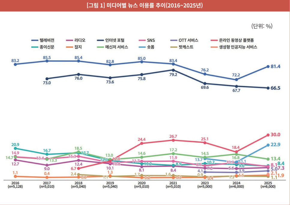 "한국언론진흥재단이 매년 실시하는 <언론수용자 조사>는 우리 국민의 미디어·뉴스 이용 행태를 종합적으로 보여주는 대표 조사다. 2025년 조사 결과를 통해 국민의 뉴스 이용에서 어떤 변화가 나타났는지 살펴본다."
