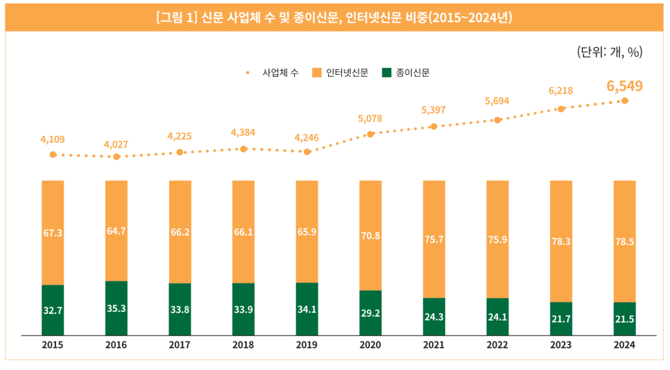 "한국언론진흥재단은 2010년부터 <신문산업 실태조사>를 실시해 왔다. 그간 언론 환경은 격변했고, 최근 AI의 발달은 신문 산업에 다시금 혁신을 요구하고 있다. <2025 신문산업 실태조사> 결과를 통해 신문 산업의 현황과 과제, 나아갈 방향을 짚어본다."