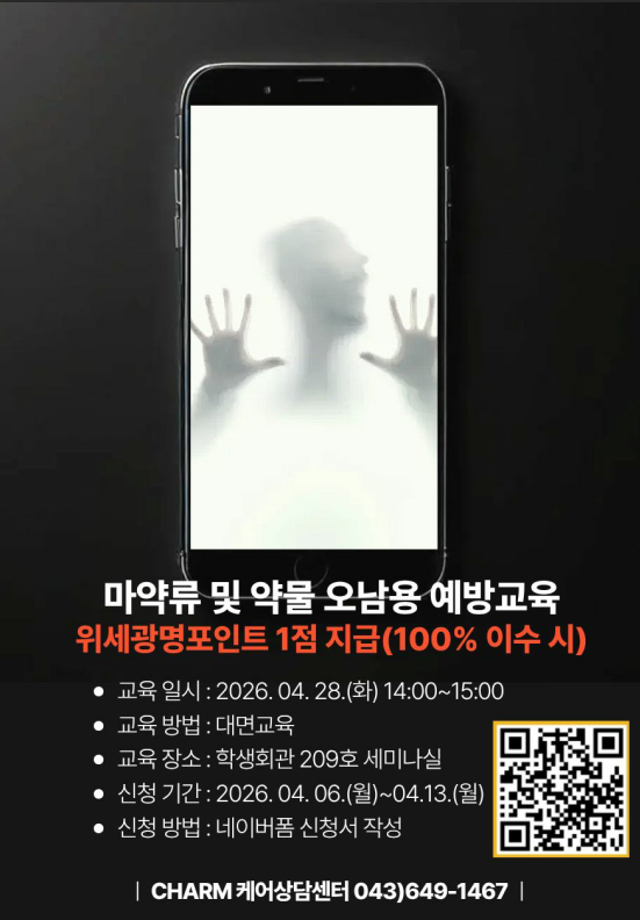 본문 시작 홈으로 학과생활 학과소개 교수소개 교과과정 학과생활 홈페이지가이드 사진게시판 공지사항 사진게시판 전공자료실 동아리 학과행사 사진게시판 페이스북 트위터 프린트 [CHARM케어상담센터] 2026학년도 1학기 "마약류 및 약물 오남용 예방교육" 실시 안내 아트앤산업디자인학과 121 2026-04-06 목록 이전[FABLAB] 3D펜을 나만의 키링 만들기 다음 [교양대학] 위세광명포인트 5점_ 2026학년도 1학기 “AI 활용능력 키우기” 수강생 모집 담당부서 : 산업디자인학과 담당자 : - 연락처 : 043-649-1436 최종수정일 : 2024-10-26 만족도조사 만족도 조사 이 페이지에서 제공하는 정보에 대하여 만족하시나요? 매우만족 만족 보통 불만족 매우불만족