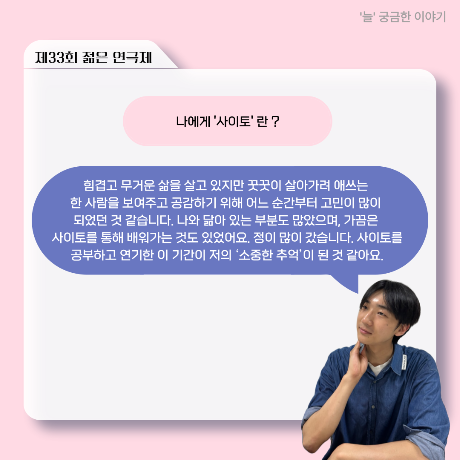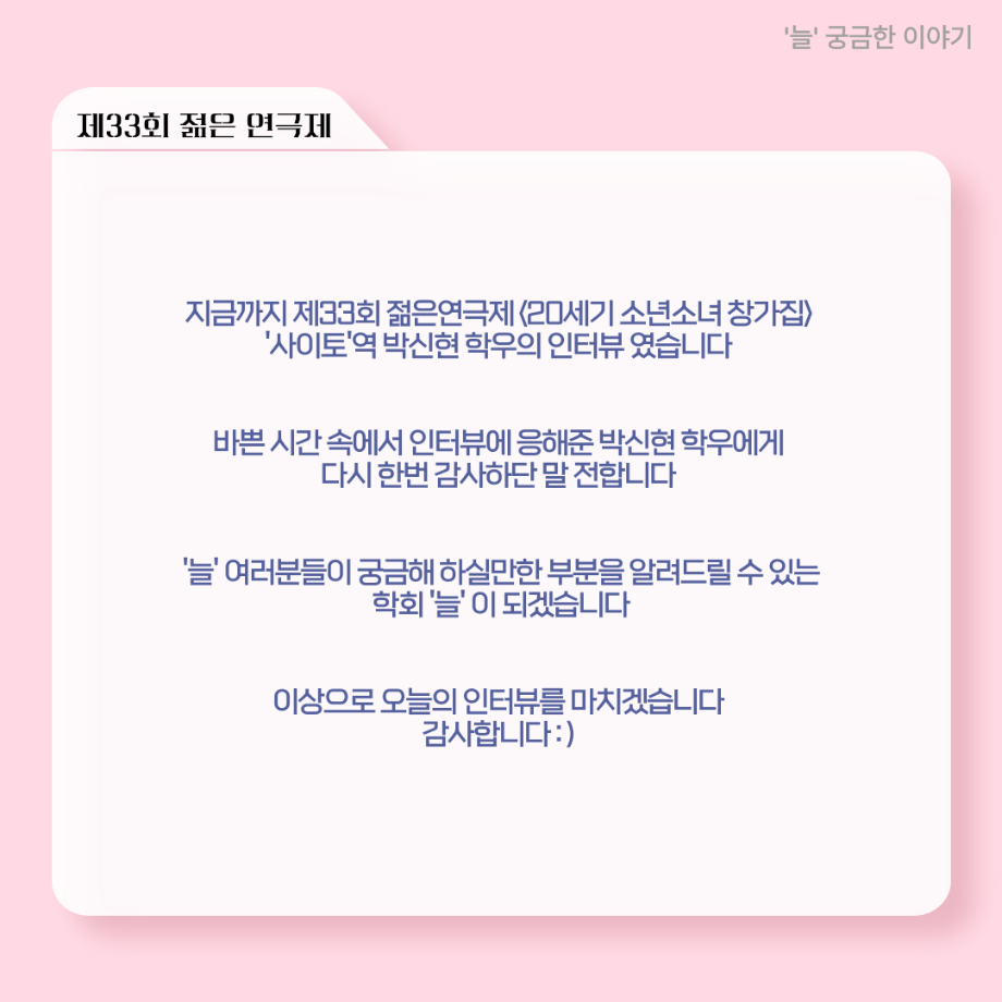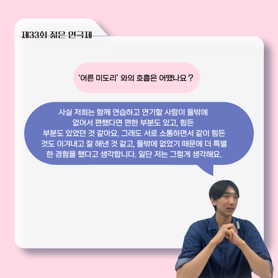 본문 시작 홈으로 커뮤니티 학과소개 입학정보 교수소개 학과과정 커뮤니티 공연예매 안내 홈페이지가이드 포토갤러리 공지사항 포토갤러리 작품DB 동아리 학사일정 학생회 포토갤러리 페이스북 트위터 프린트 ‘늘‘ 궁금한 이야기 - 젊은연극제 ‘20세기 소년소녀 창가집’ 사이토 役 < 박신현 > 연기예술학과 511 2025-08-15 . 목록 다음 2025년 세명대학교 연기예술학과 2학기 개강총회 다음 ‘늘‘ 궁금한 이야기 - 젊은연극제 ‘20세기 소년소녀 창가집’ 종이연극 아저씨 役 < 윤준호 > 담당부서 : 연기예술학과 담당자 : 박솔빈 연락처 : 043-649-1733 최종수정일 : 2024-10-26 만족도조사 만족도 조사 이 페이지에서 제공하는 정보에 대하여 만족하시나요? 매우만족 만족 보통 불만족 매우불만족